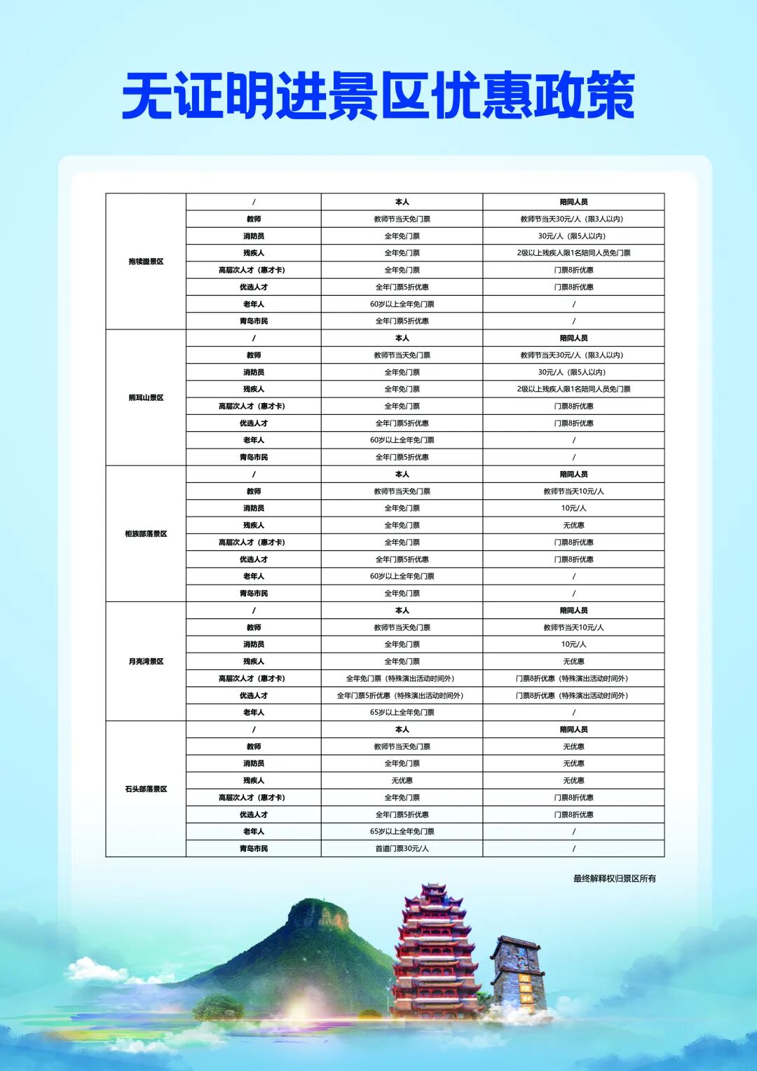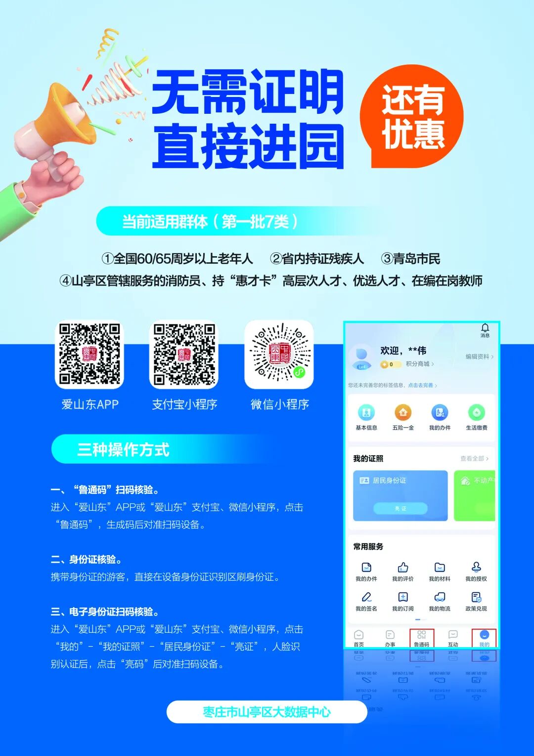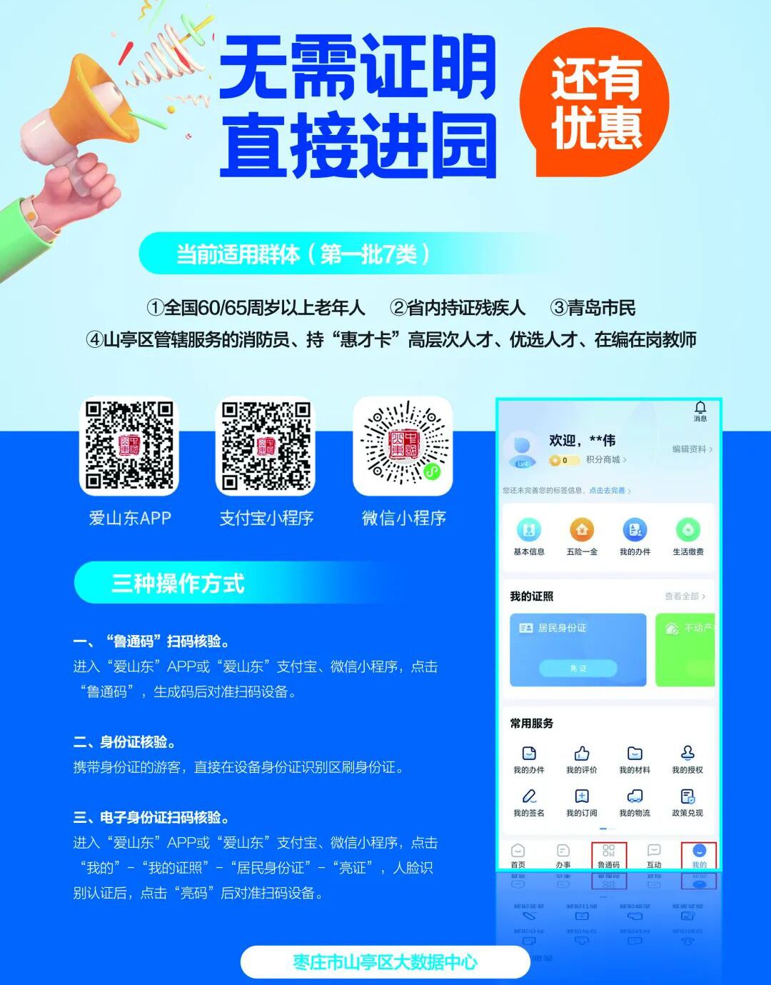 即日起,全国65周岁以上老年人,省内持证残疾人,青岛市民,山亭区管辖服务的消防员、持“惠才卡”高层次人才、优选人才、在编在岗教师,无需携带消防员证、残疾证、惠才卡、教师资格证等纸质证件,通过扫“鲁通码”、扫“电子身份证”二维码、刷实体身份证(三者任选其一)等方式即可直接入园或享受门票优惠减免政策。详细操作方式和政策内容如下: