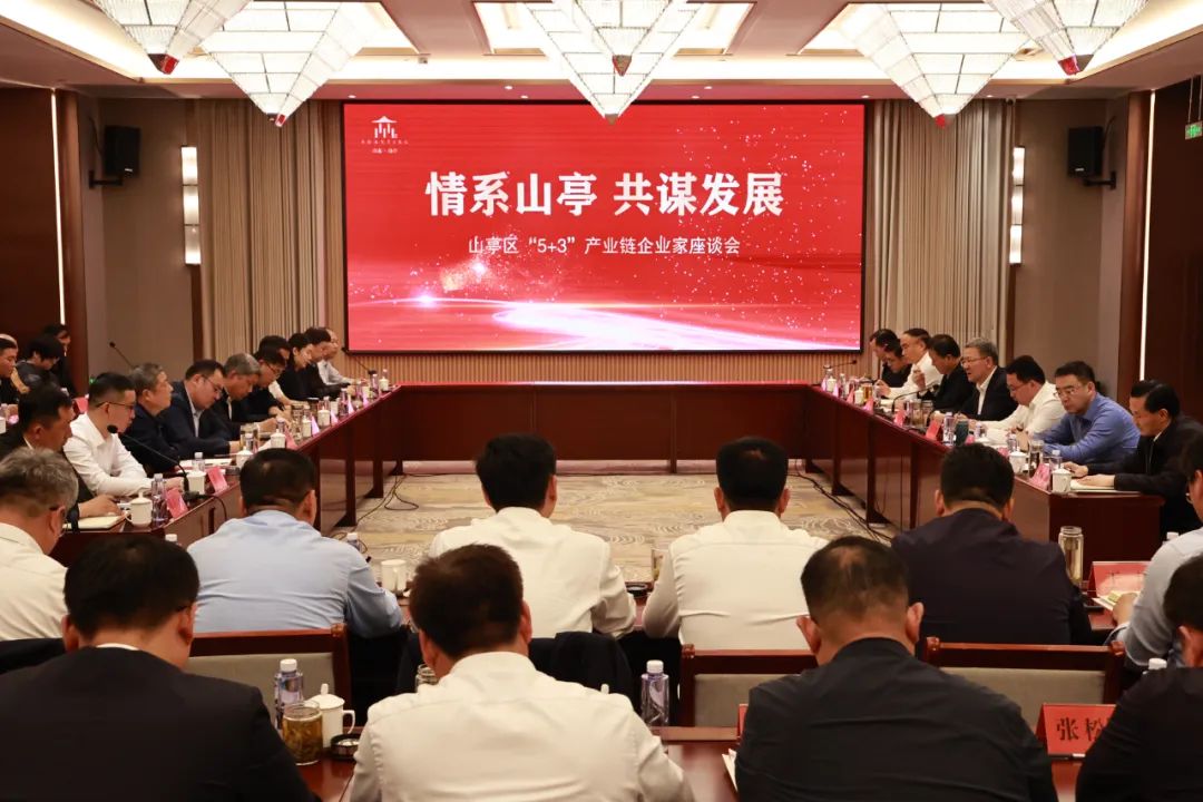 4月11日,“情系山亭 共谋发展”——山亭区“5+3”产业链企业家座谈会召开。区委书记王德海出席并讲话,区委副书记、区长刘洪鹏主持会议。李洪波、周琪、王绪景、李峰、宗晓庆、褚福涛、燕勇参加。全区“5+3”产业链企业代表应邀参会。