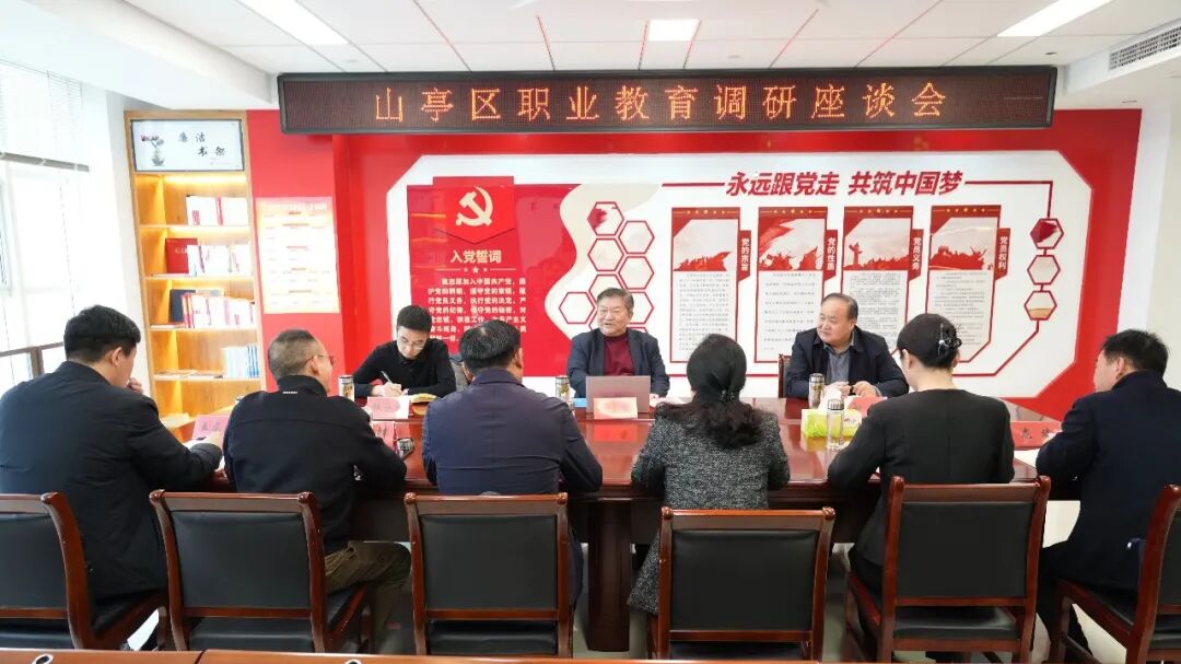 近日,山东省职业技术教育学会会长石忠到山亭调研我区职业教育发展情况并召开座谈会;市教育局党组成员、总督学孙斌,区委副书记、区长刘洪鹏,区政府党组成员、副区长戴娟等相关负责同志陪同。