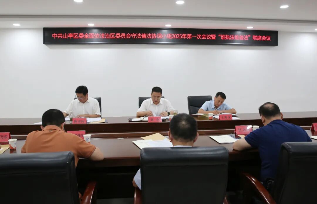 会上传达了市委全面依法治市委员会守法普法协调小组2025年第一次全体(扩大)会议暨“谁执法谁普法”履职评议汇报会会议精神,《枣庄市国家机关“两单两函两书一评查”普法工作制度》《枣庄市青少年普法工作指引》《枣庄市青少年法治素养强基计划实施方案》《2025年全区普法依法治理工作要点》。会议听取了山亭区2024年守法普法工作情况汇报。区教体局、区行政审批服务局、山城街道、冯卯镇分别对“谁执法谁普法”普法责任制落实情况进行汇报,参会人员进行现场评议打分。