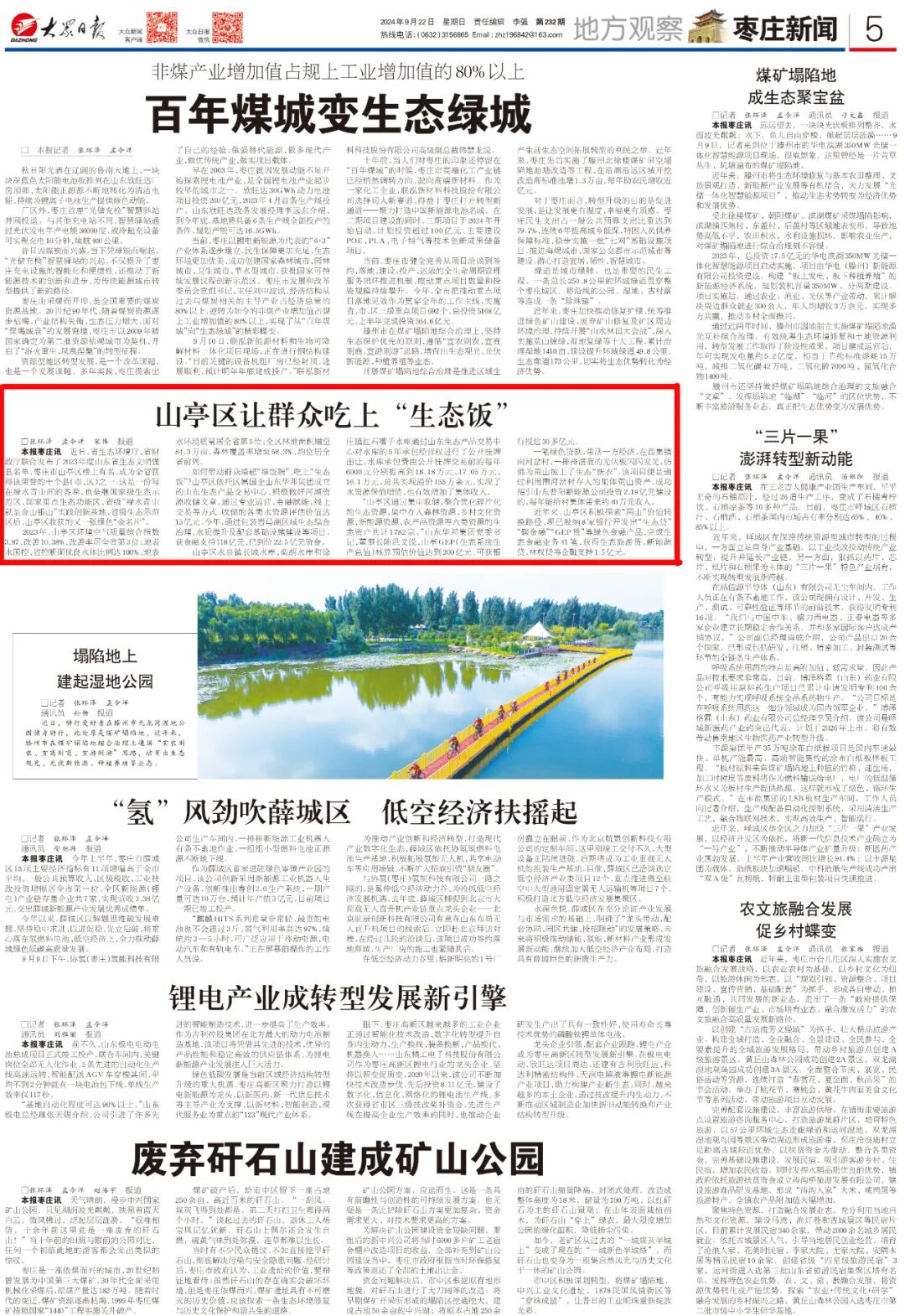 如何带动群众端起“绿饭碗”、吃上“生态饭”?山亭区依托区属国企山东华邦集团成立的山东生态产品交易中心,积极做好河湖资源收储文章。通过专业运营、金融赋能、线上交易等方式,收储的各类水资源评估价值达15亿元。今年,通过包装岩马湖区域生态综合治理、水质提升及配套基础设施建设等项目,获金融支持118亿元,已到位22.5亿元资金。