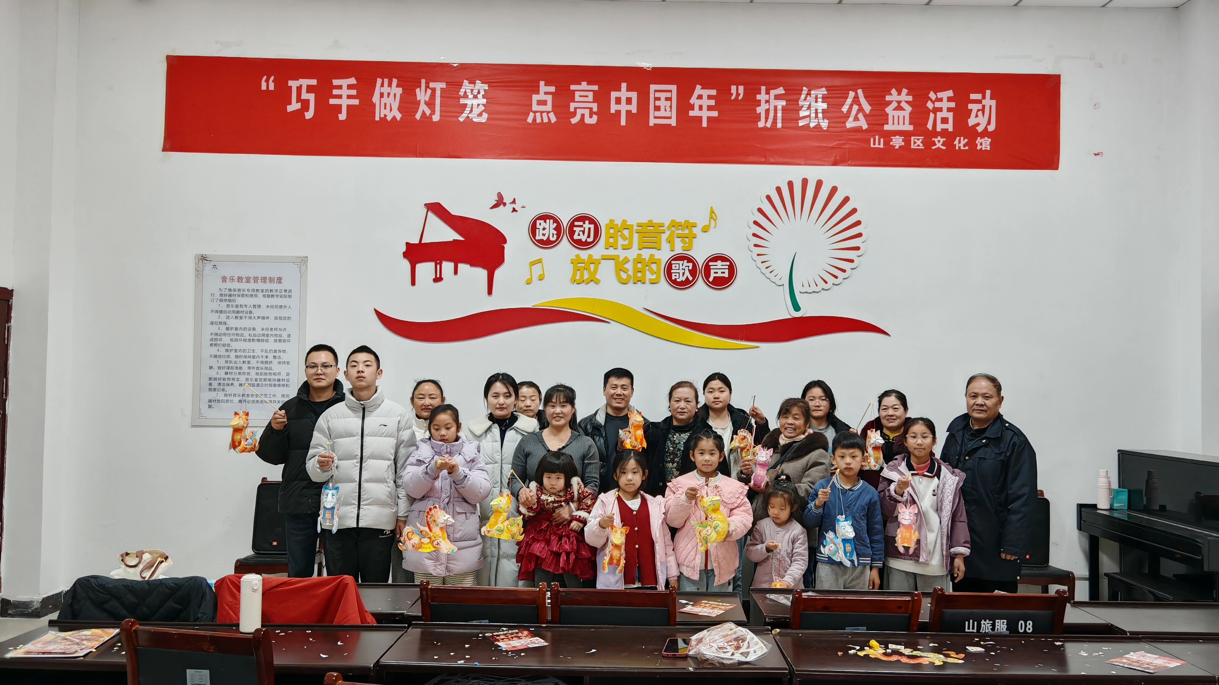 2月28日(正月十二)上午,山亭区文化馆“巧手做灯笼·点亮中国年”新春折纸公益活动在音乐教室温馨举行。活动现场,老师细致讲解折纸技巧,手把手示范制作流程,耐心指导每一个步骤。家长与孩子携手协作、默契配合,大手牵着小手认真折叠、细心粘贴、精心装饰,孩子们尽情发挥创意,一件件精巧喜庆的新春灯笼陆续完成,现场暖意融融、欢声笑语不断,浓浓年味扑面而来。