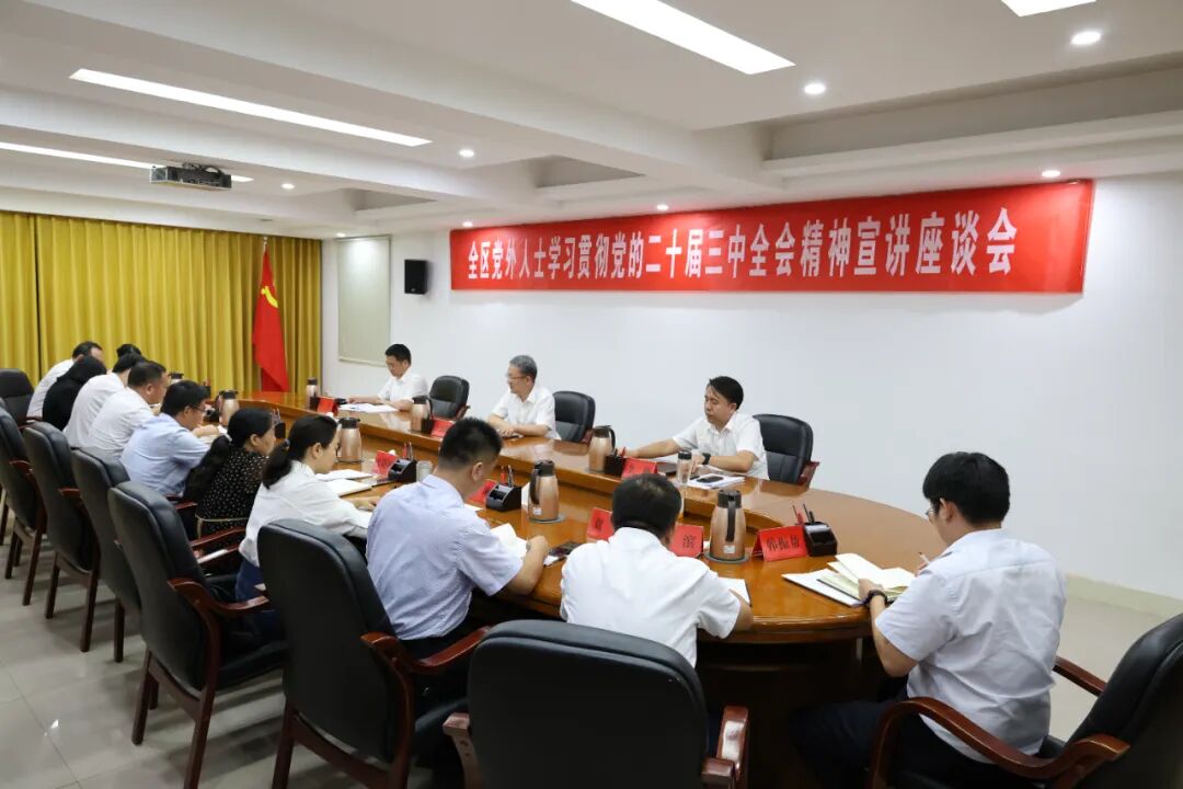 8月19日,全区党外人士学习贯彻党的二十届三中全会精神宣讲座谈会召开。区委书记王德海出席并宣讲党的二十届三中全会精神。李峰、刘杰参加。