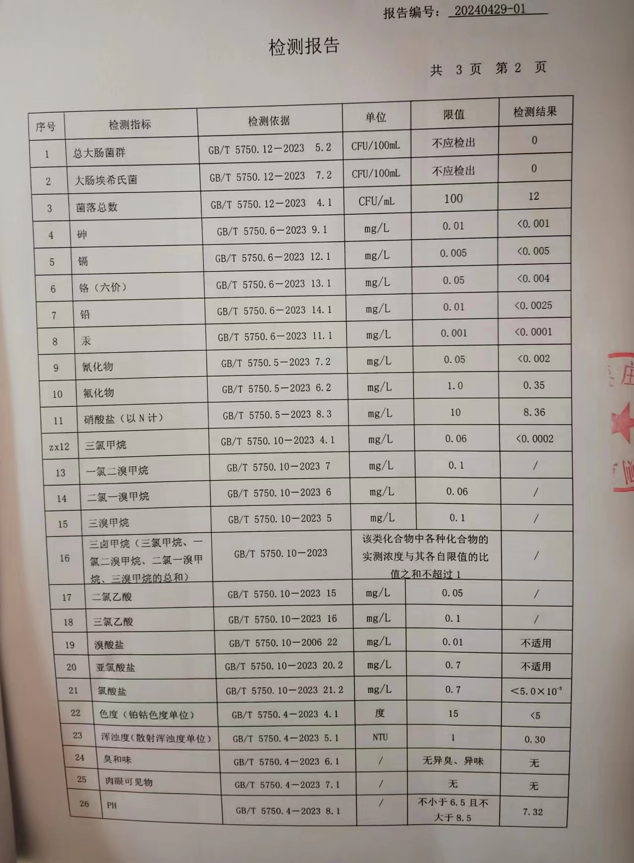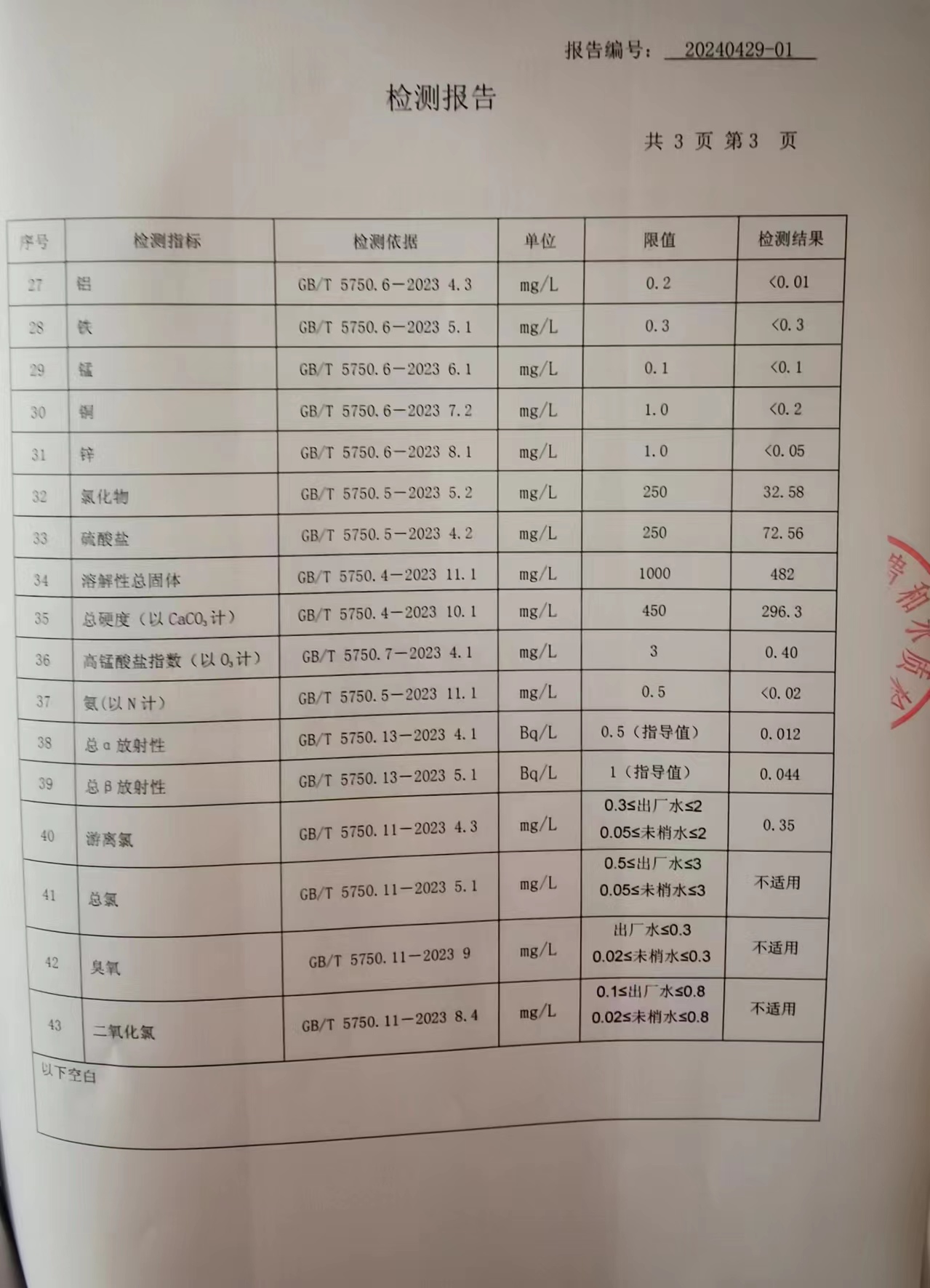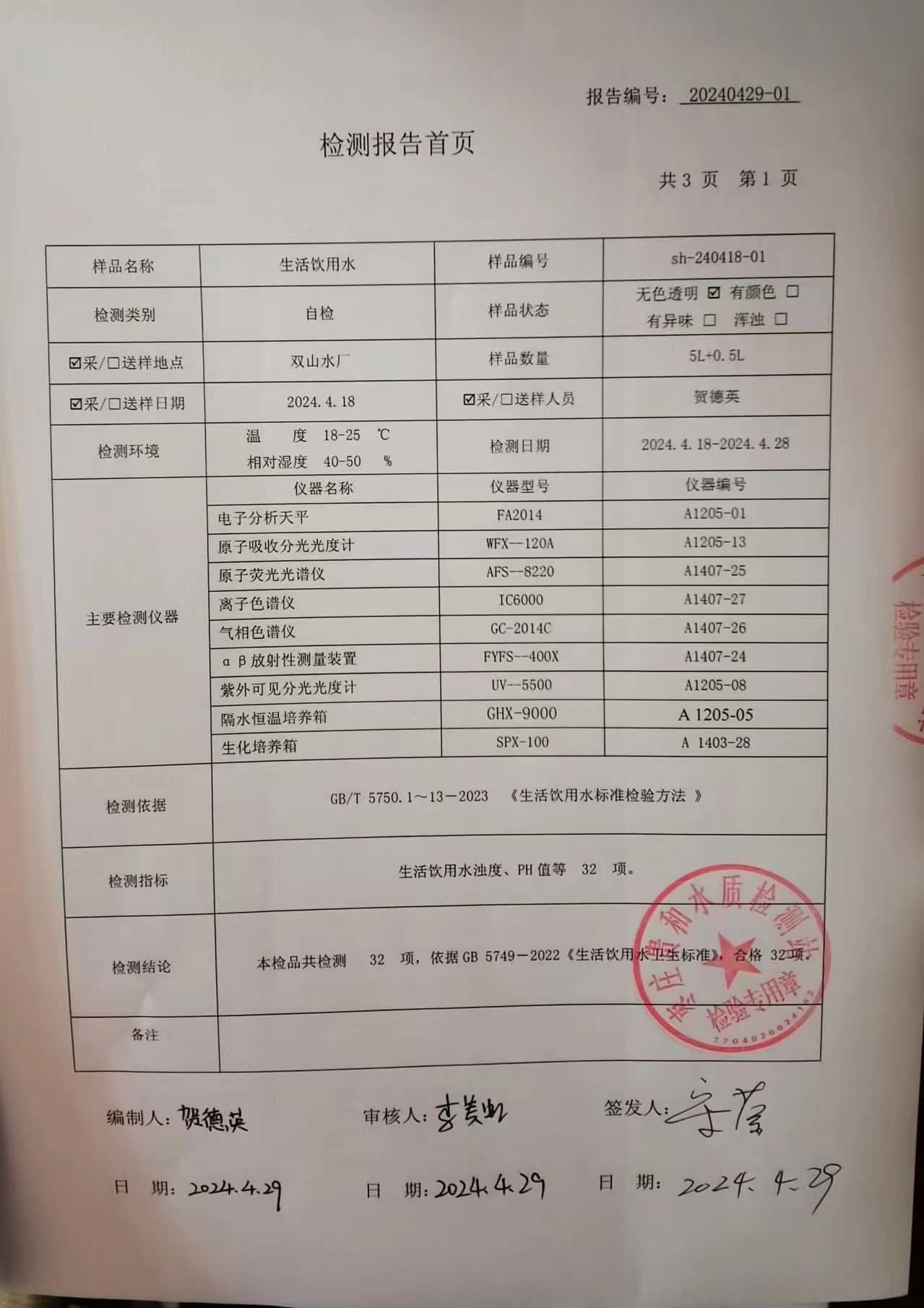 【出厂水】2024年4月份山亭区自来水厂出厂水检测报告