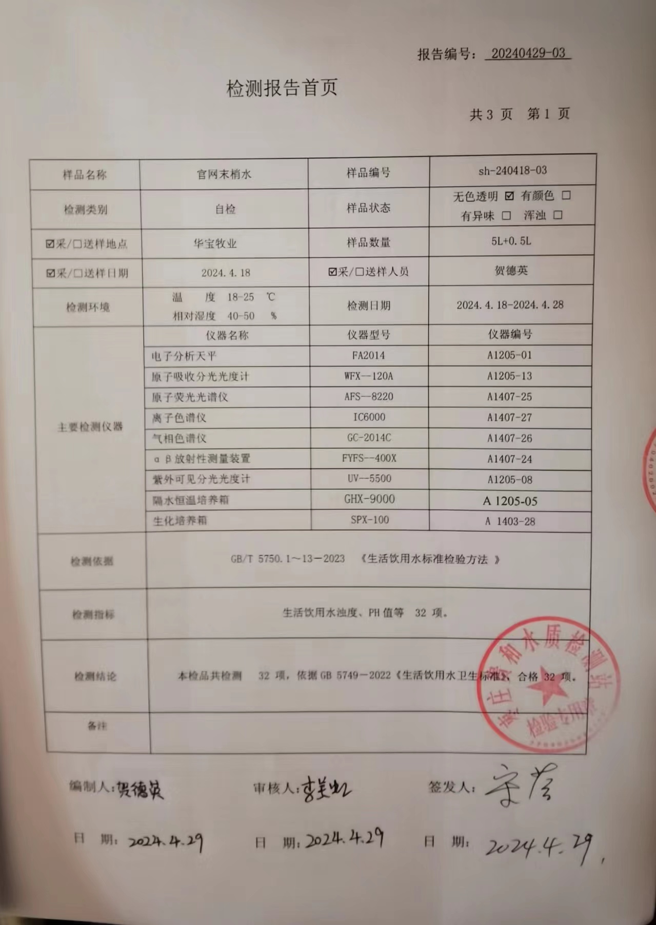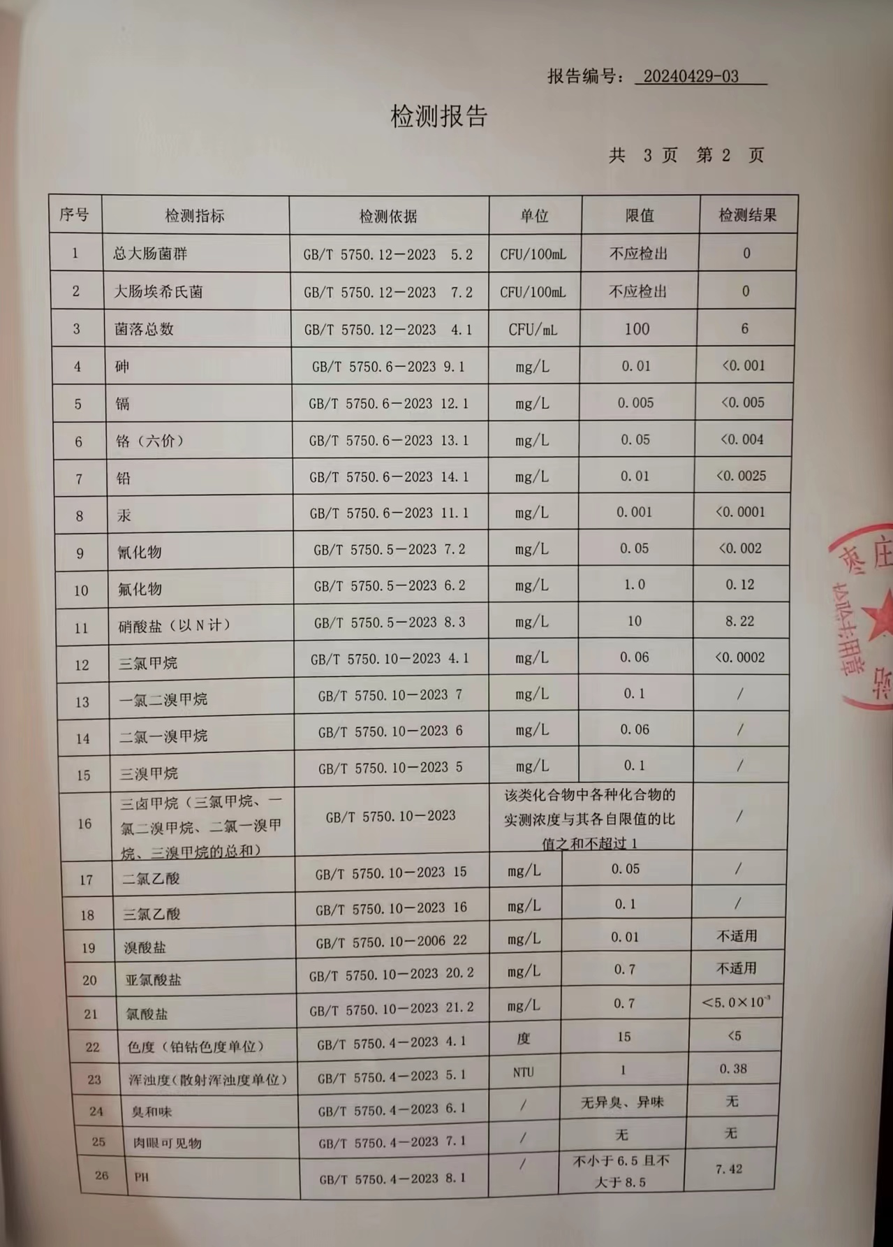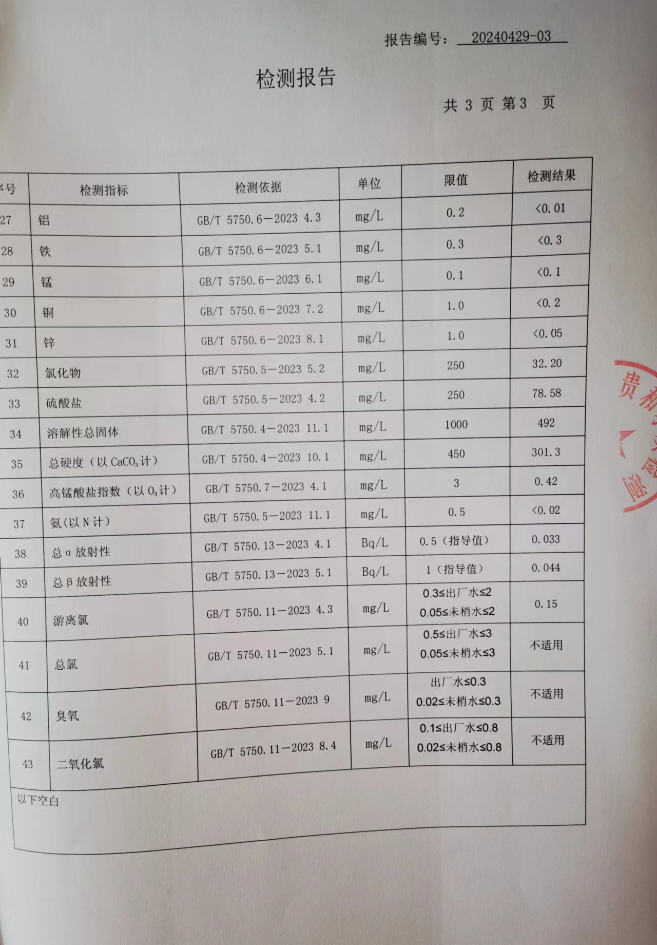 【管网末梢水】2024年4月份山亭区管网末梢水检测报告
