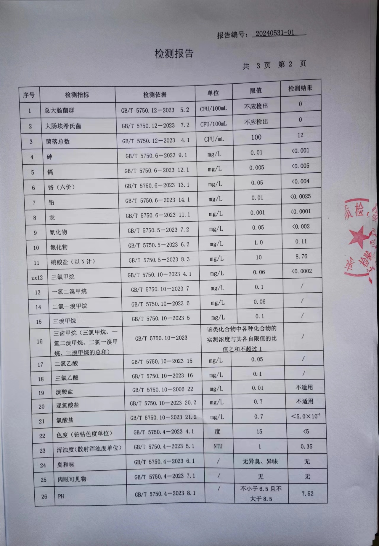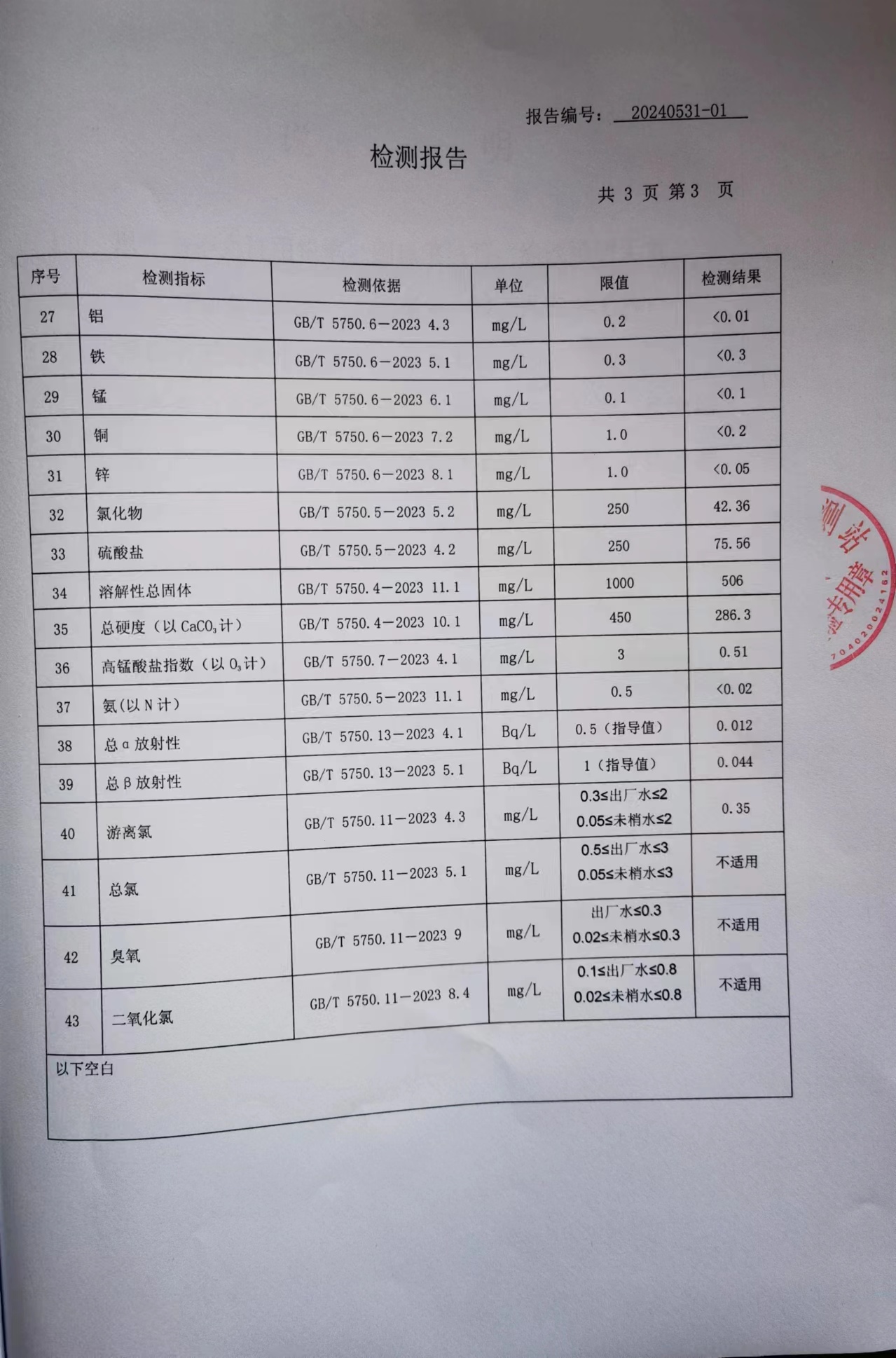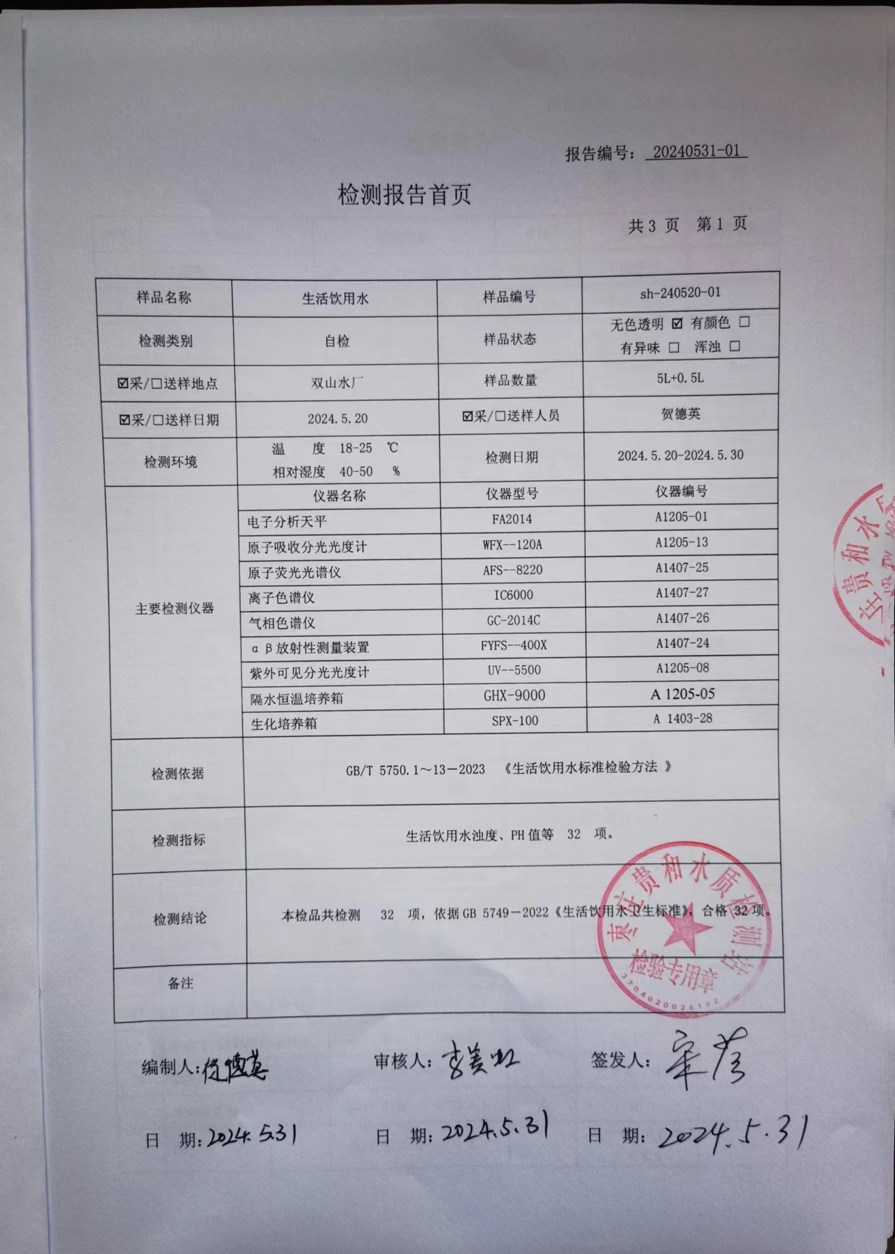 【出厂水】2024年5月份山亭区自来水厂出厂水检测报告