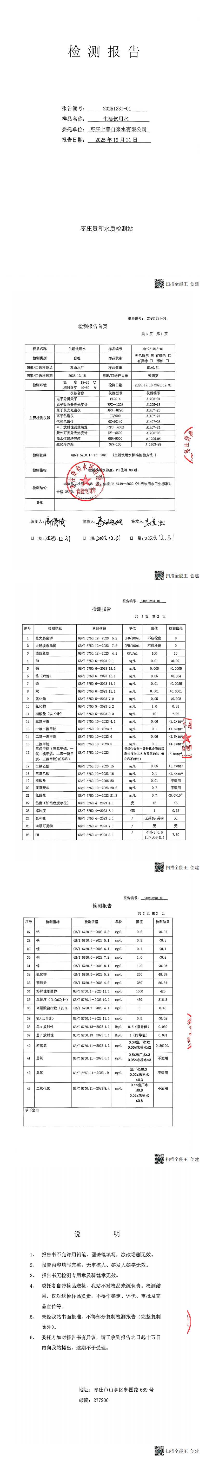 【出厂水】2025年12月份山亭区自来水厂出厂水检测报告
