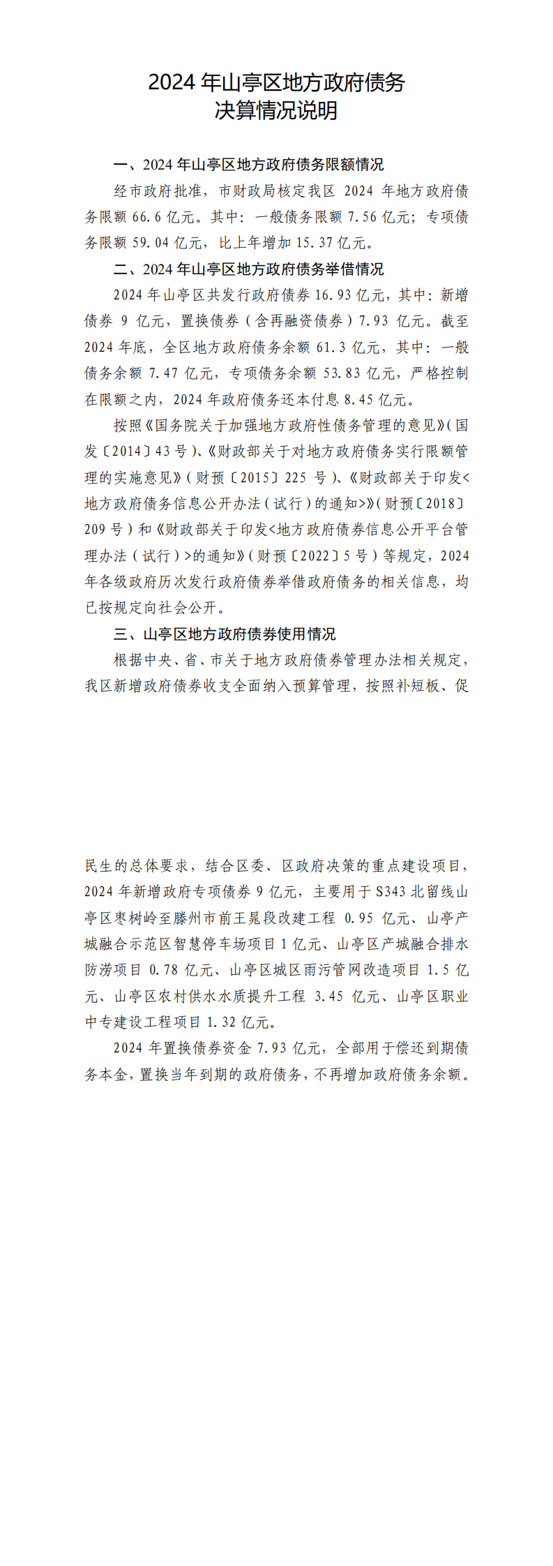 【决算】2024 年山亭区地方政府债务决算情况说明