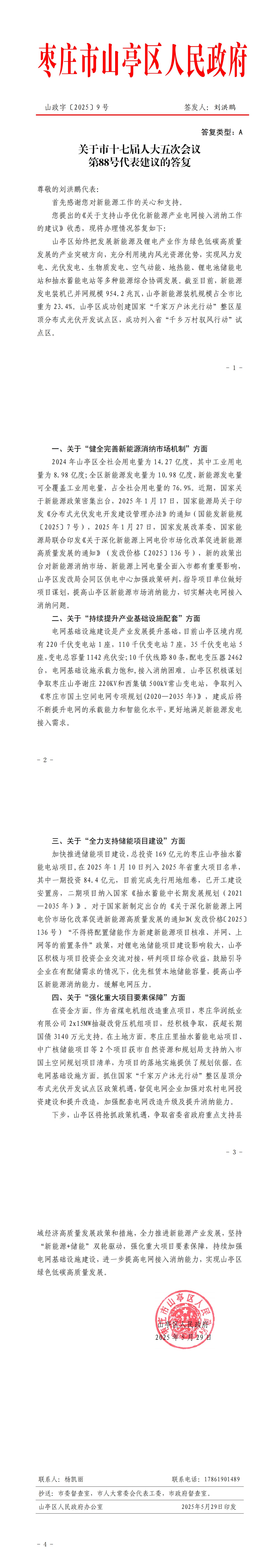 关于市十七届人大五次会议第88号代表建议(关于支持山亭优化新能源产业电网接入消纳工作)的 答复