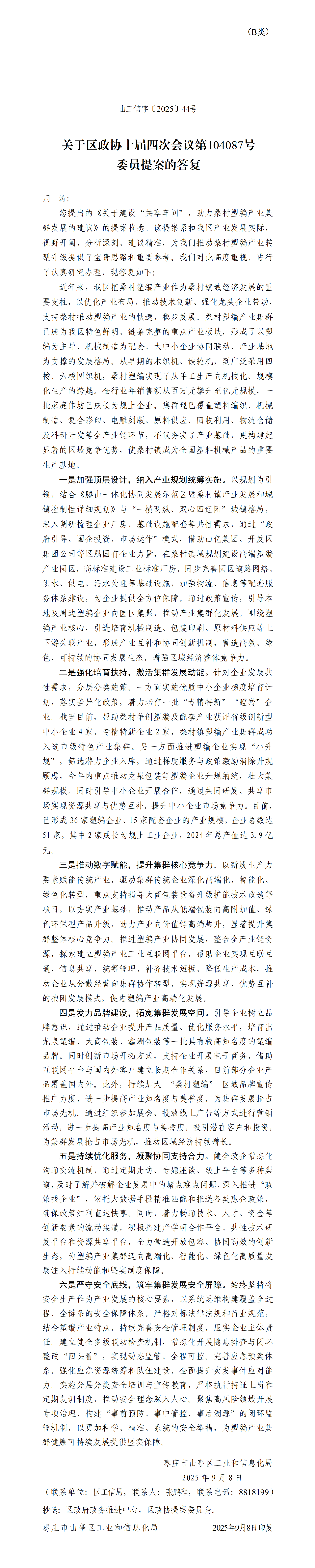 关于区政协十届四次会议第104087号委员提案(关于建设“共享车间”,助力桑村塑编产业集群发展)的答复