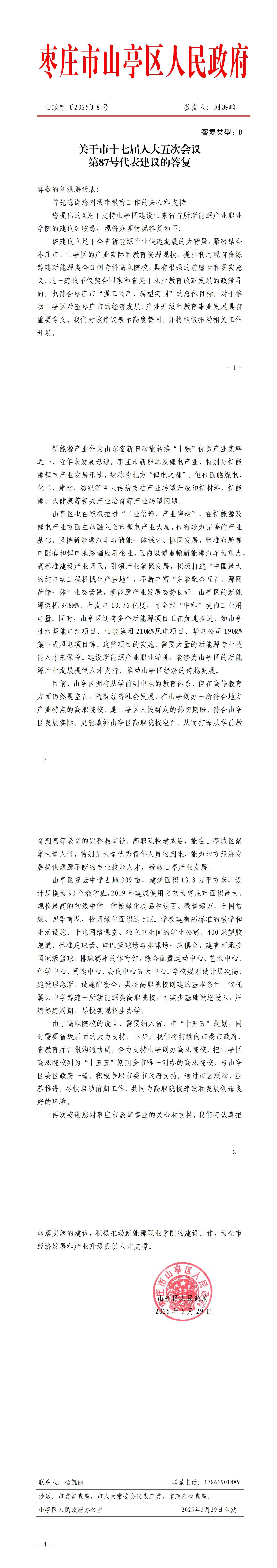 关于市十七届人大五次会议第87号代表建议(关于支持山亭区建设山东省首所新能源产业职业学院)的答复