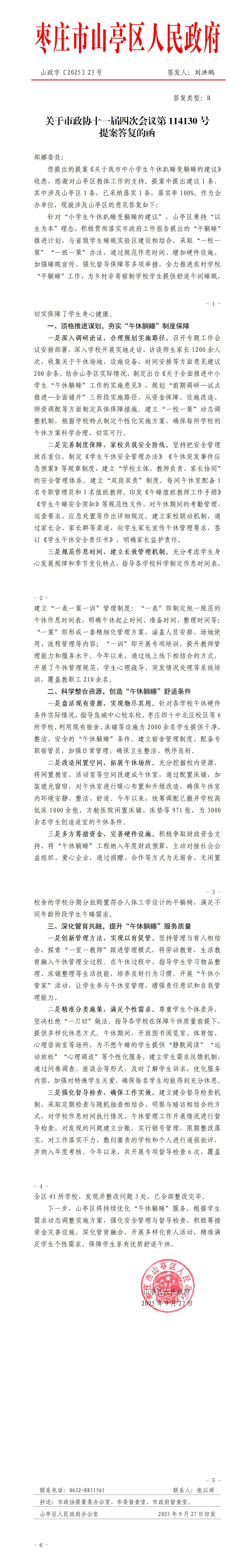 关于对市政协十一届四次会议第114130号委员提案(关于我市中小学生午休趴睡变躺睡)的答复