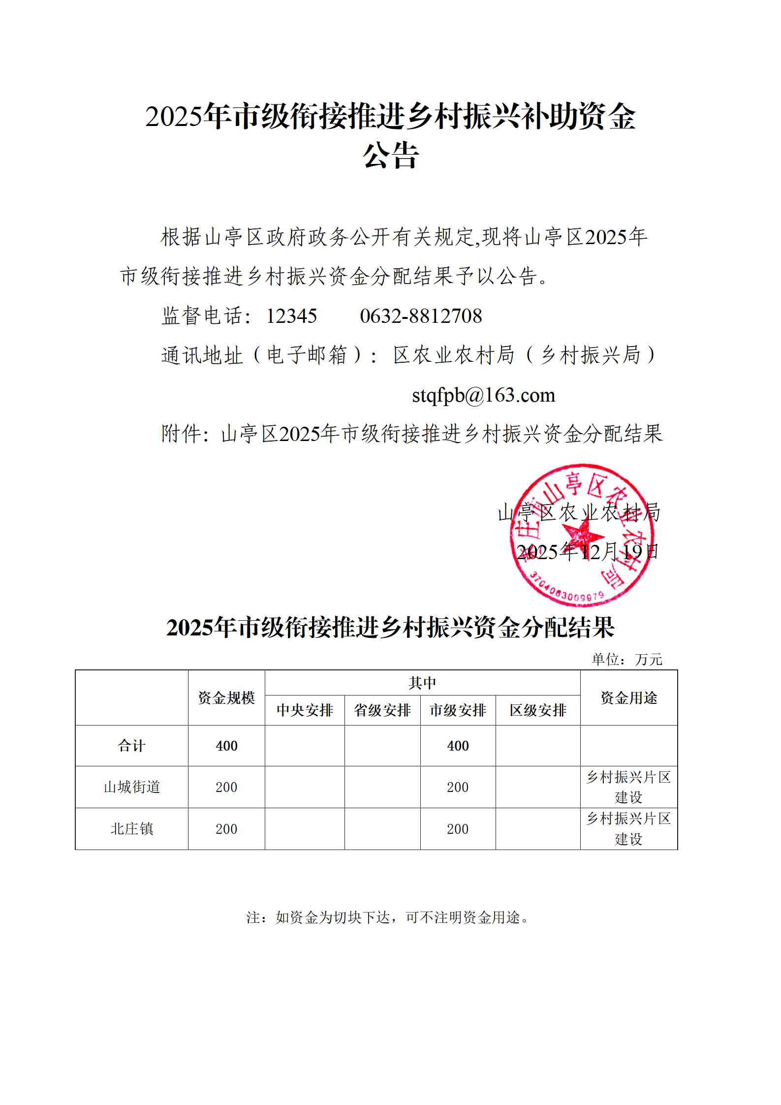 【资金分配】2025年市级衔接推进乡村振兴补助资金公告