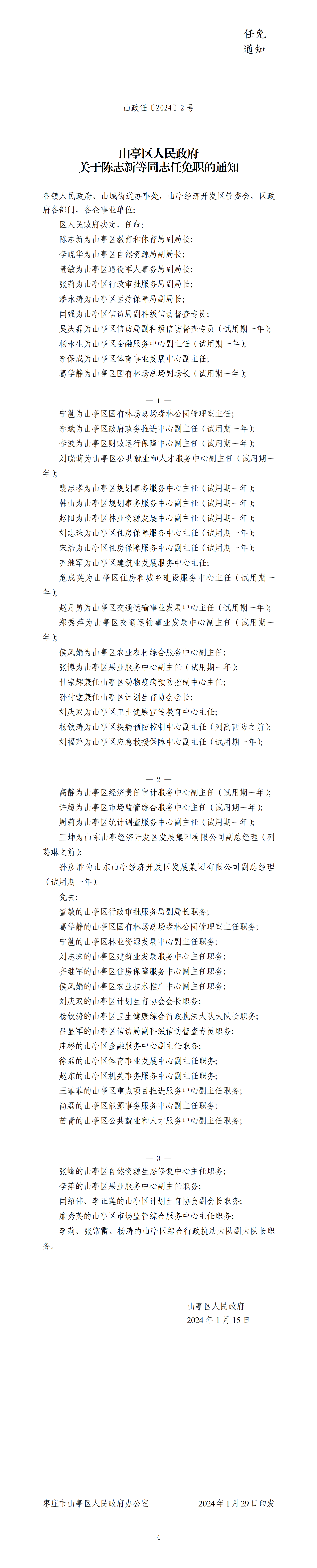 山政任〔2024〕2号山亭区人民政府关于陈志新等同志任免职的通知