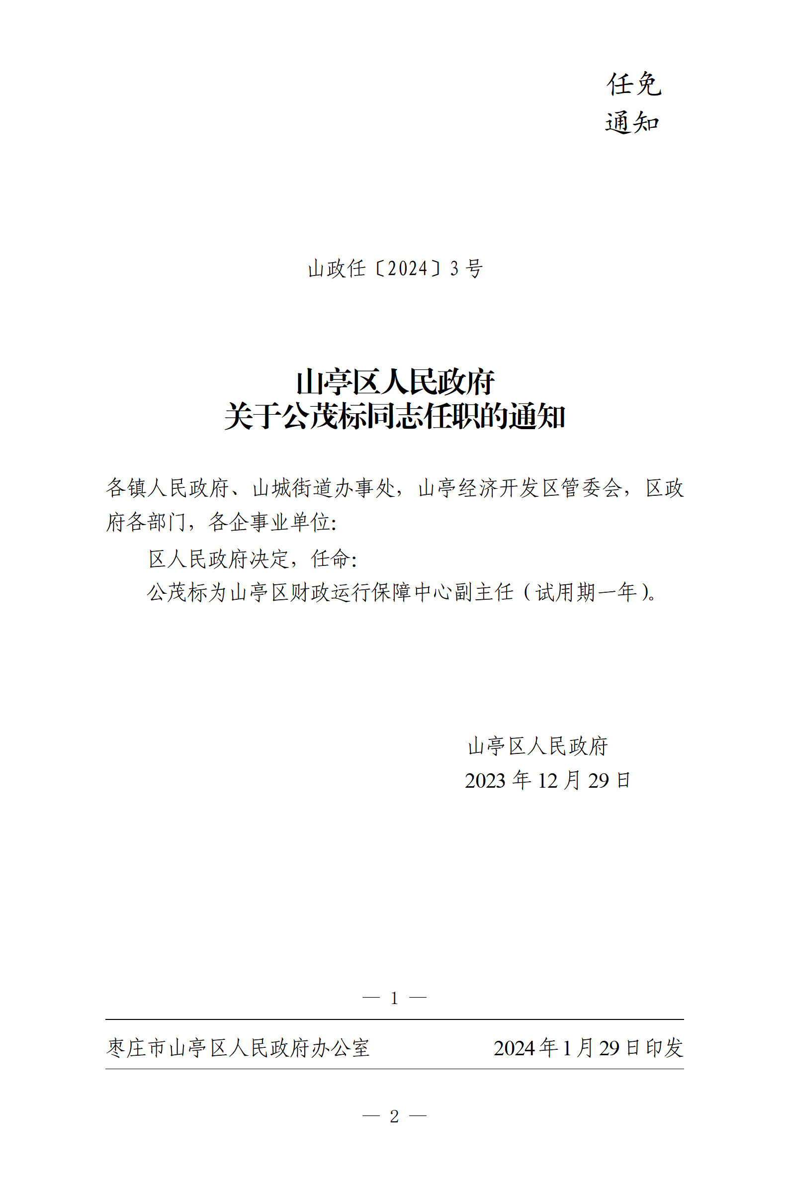 山政任〔2024〕3号山亭区人民政府关于公茂标同志任职的通知