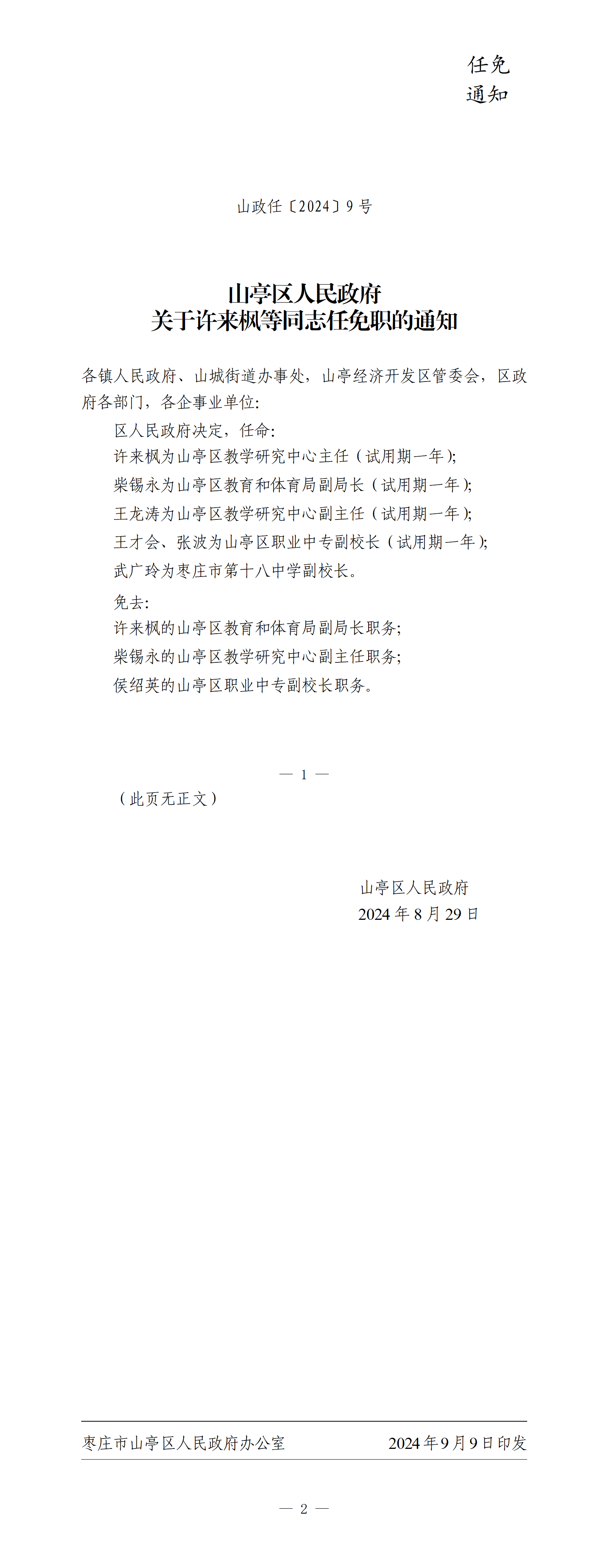 山政任〔2024〕9号山亭区人民政府关于许来枫等同志任免职的通知