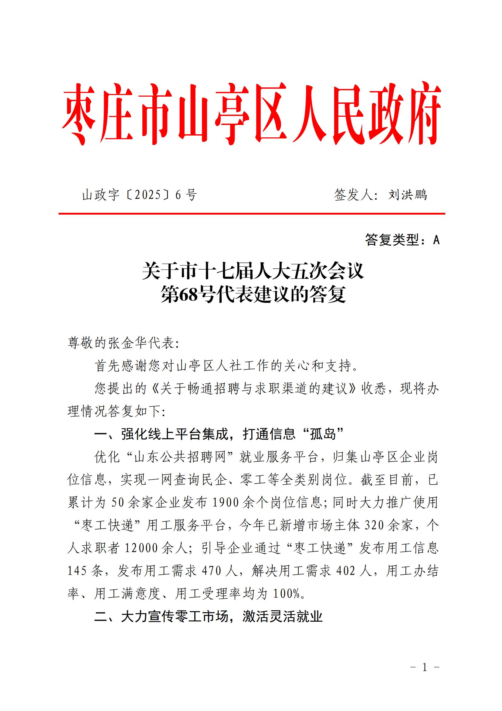 关于市十七届人大五次会议第68号代表建议(关于畅通招聘与求职渠道)的答复