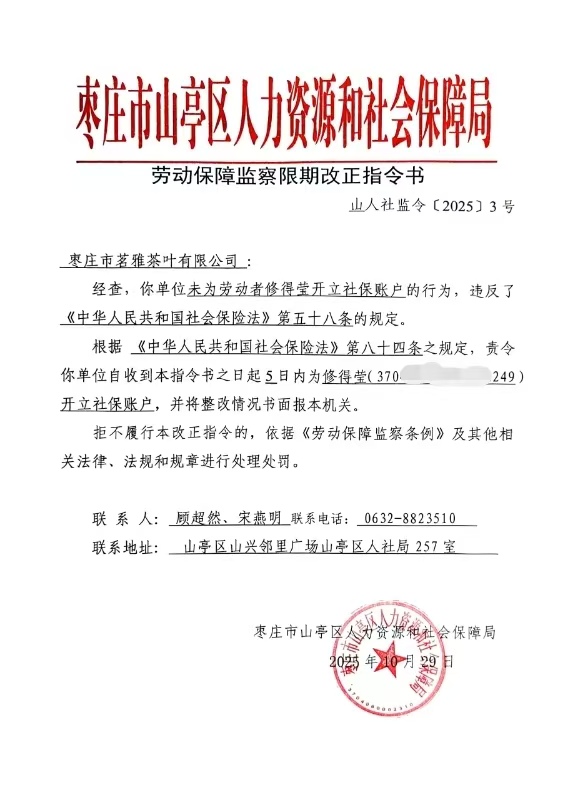 附:枣庄市山亭区人力资源和社会保障局《劳动保障监察限期改正指令书》(山人社监令〔2025〕3号)。