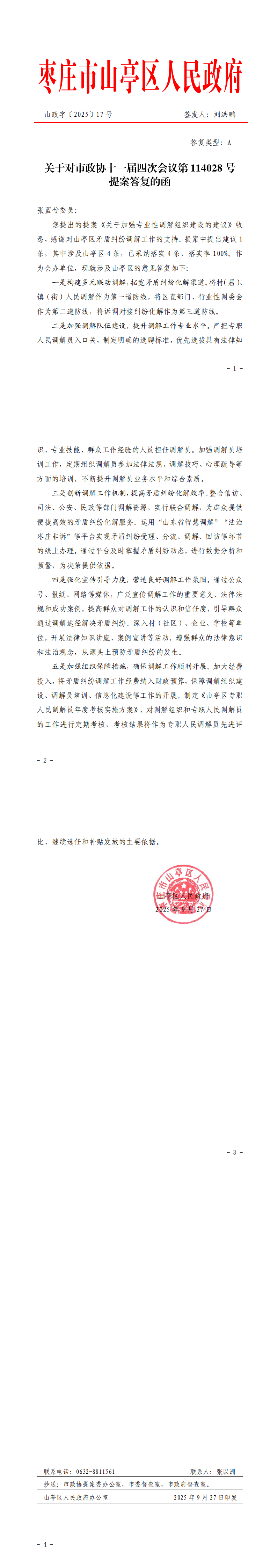 关于对市政协十一届四次会议第114028号委员提案(关于加强专业性调解组织建设)的答复