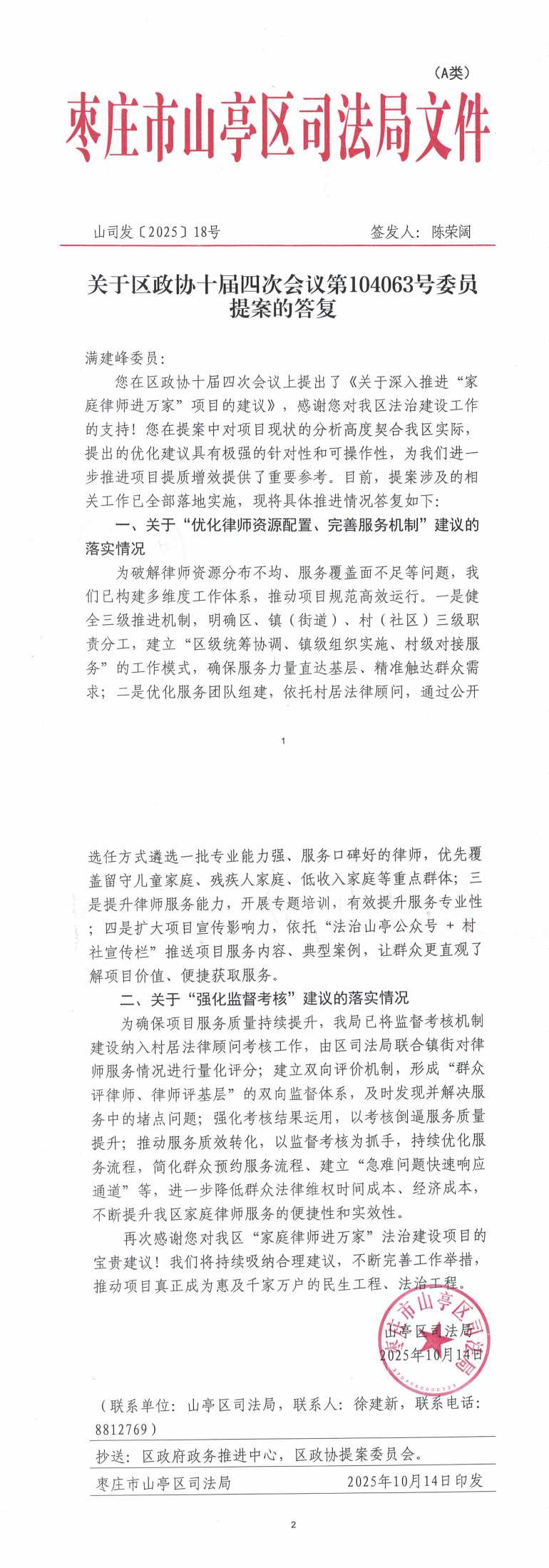 关于区政协十届四次会议第104063号委员提案(关于深入推进家庭律师进万家项目)的答复