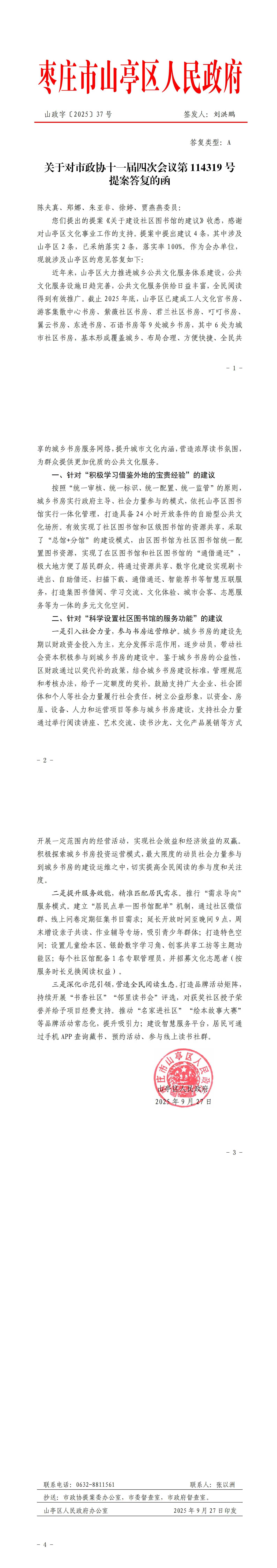 关于对市政协十一届四次会议第114319号委员提案(关于建设社区图书馆)的答复