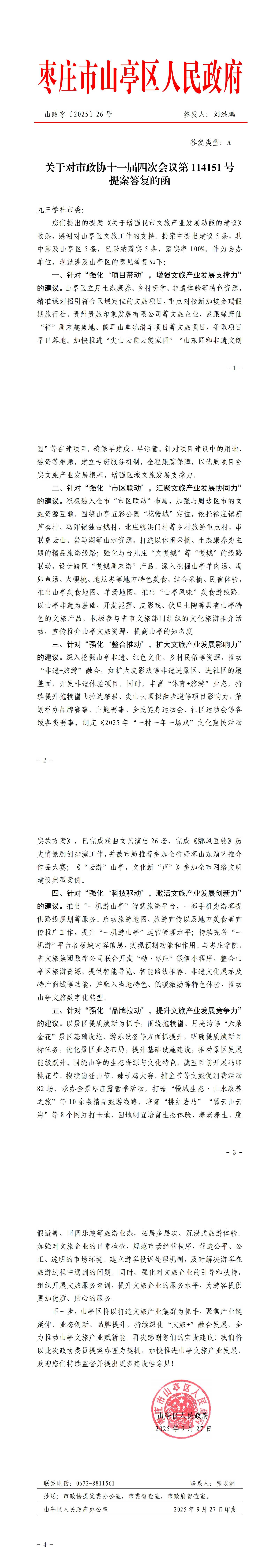 关于对市政协十一届四次会议第114151号委员提案(关于增强我市文旅产业发展动能)的答复