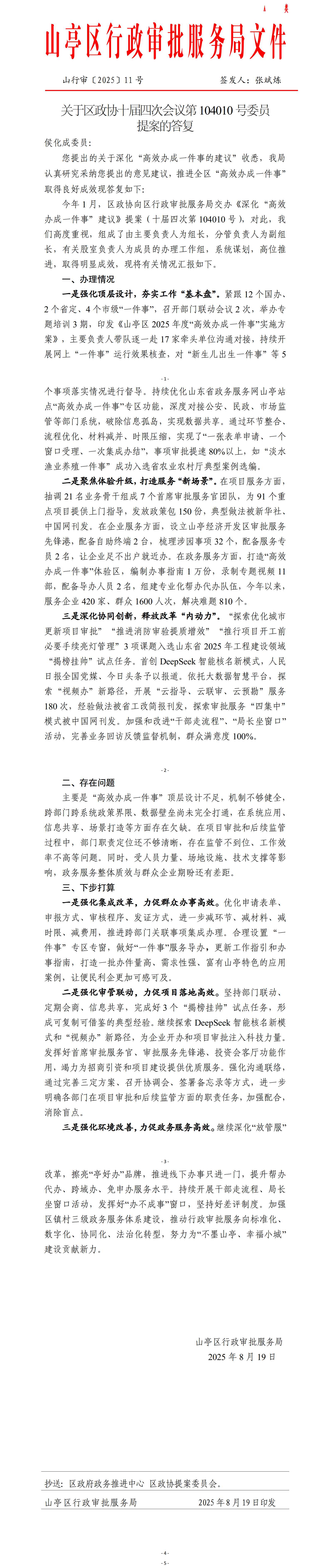 关于区政协十届四次会议第104010号委员提案(关于深化“高效办成一件事的建议”)的答复