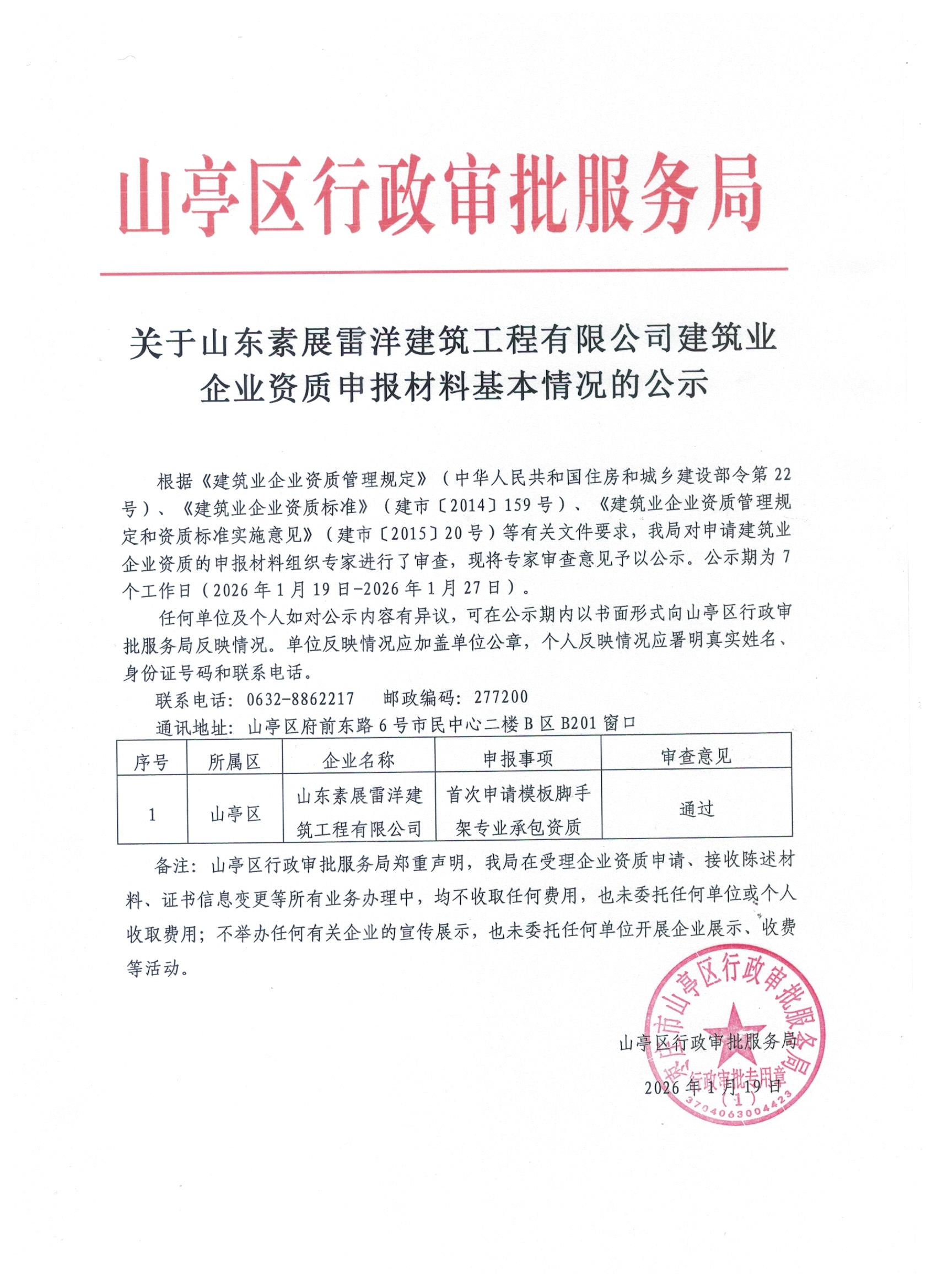 关于山东素展雷洋建筑工程有限公司建筑业企业资质申报材料基本情况的公示