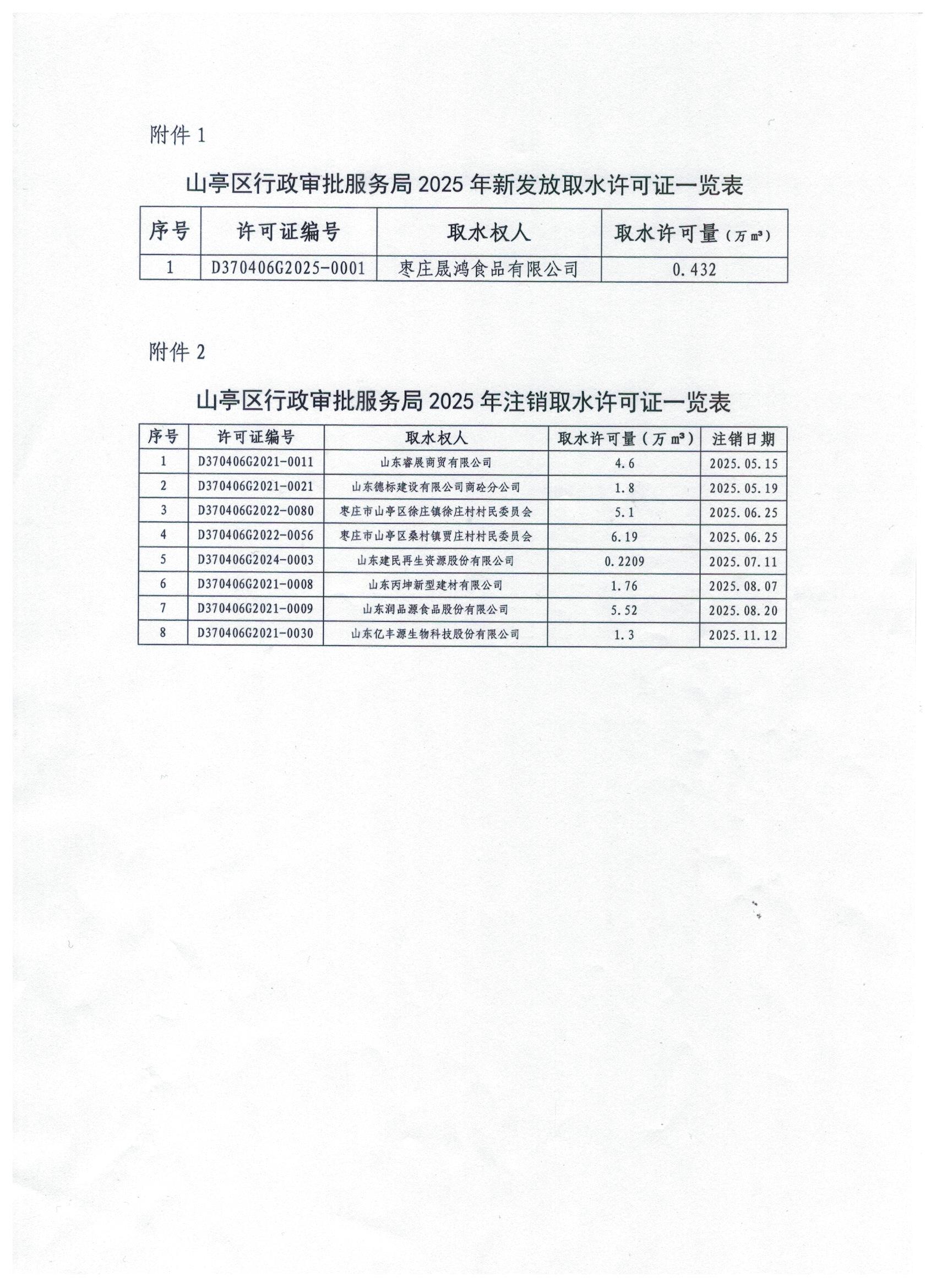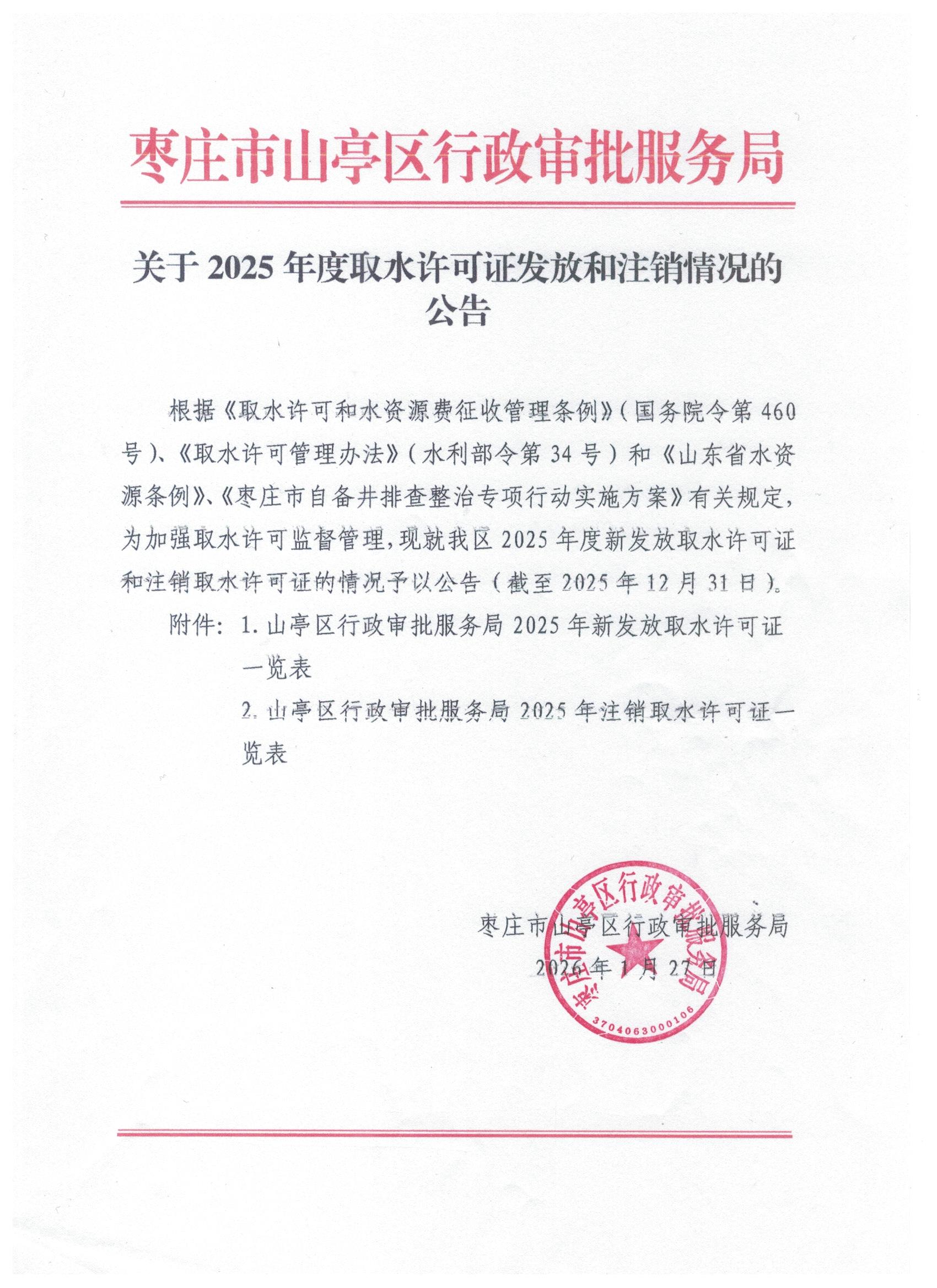枣庄市山亭区行政审批服务局关于2025年度取水许可证发放和注销情况的公告
