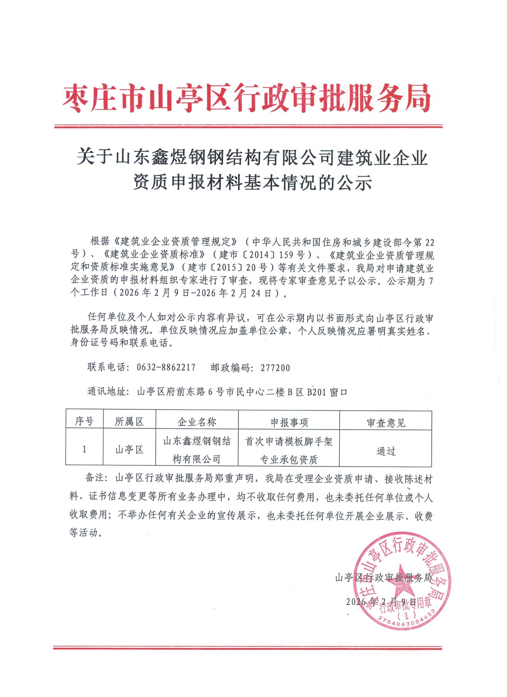 关于山东鑫煜钢钢结构有限公司建筑业企业资质申报材料基本情况的公示