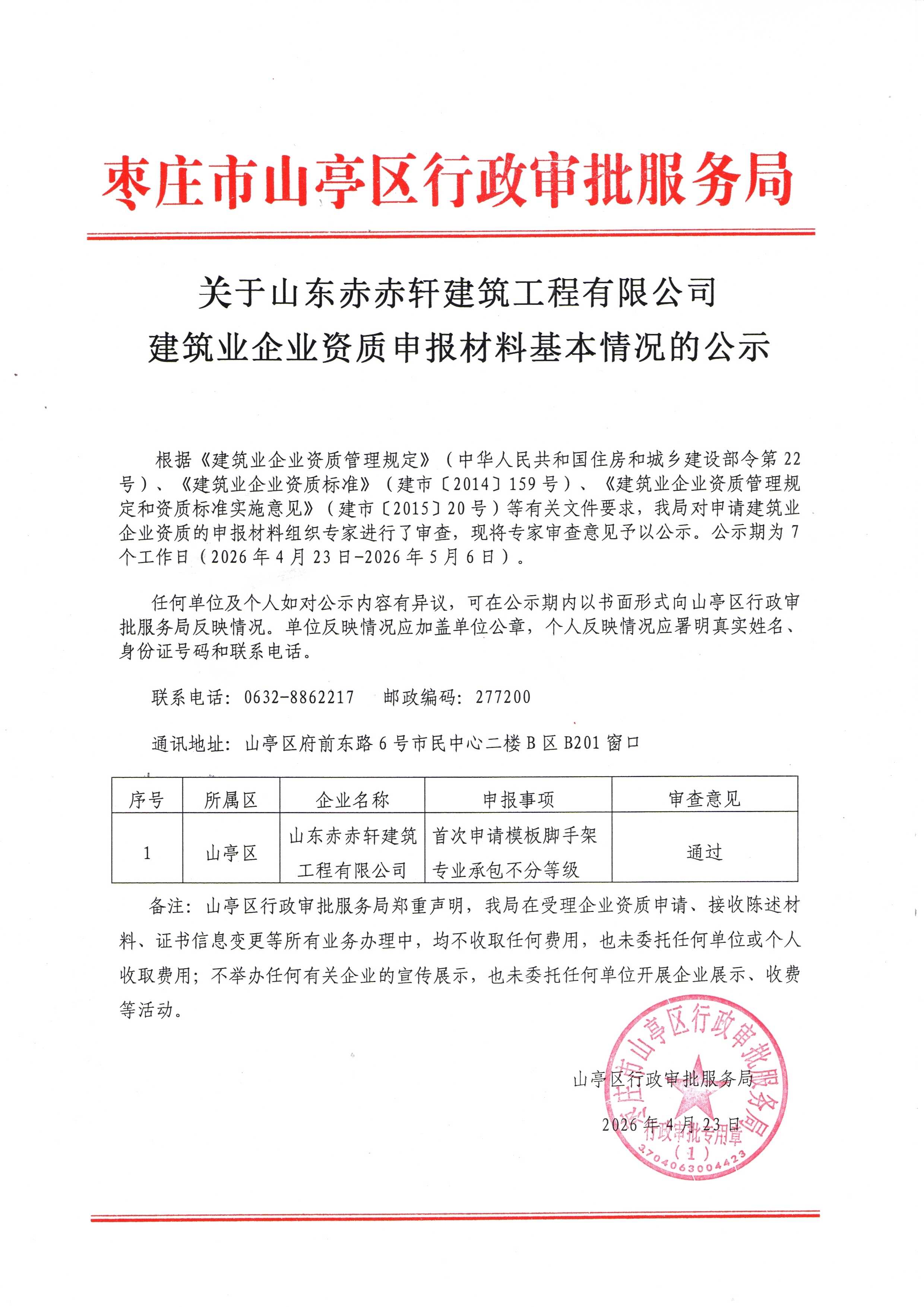 关于山东赤赤轩建筑工程有限公司 建筑业企业资质申报材料基本情况的公示