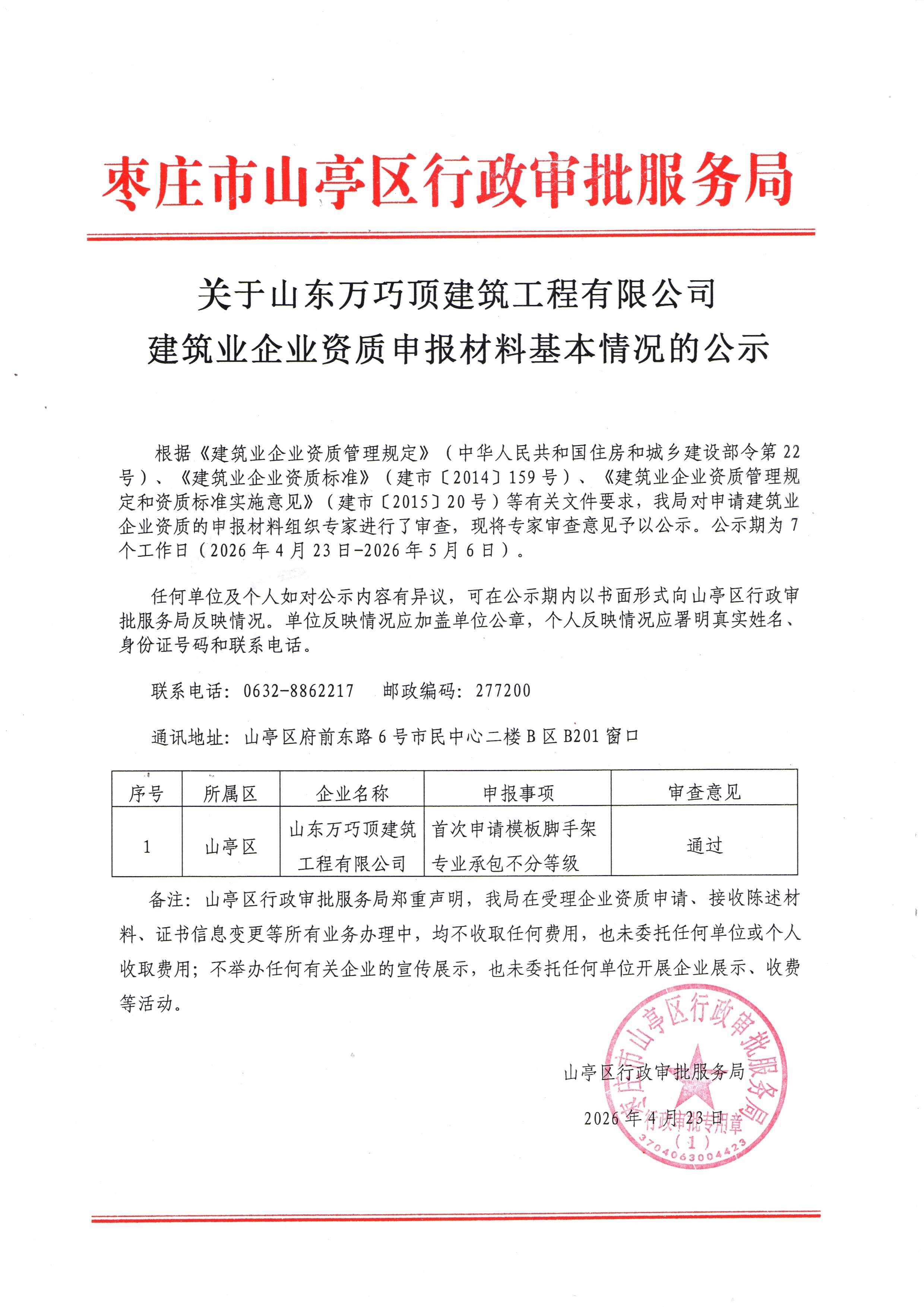 关于山东万巧顶建筑工程有限公司 建筑业企业资质申报材料基本情况的公示