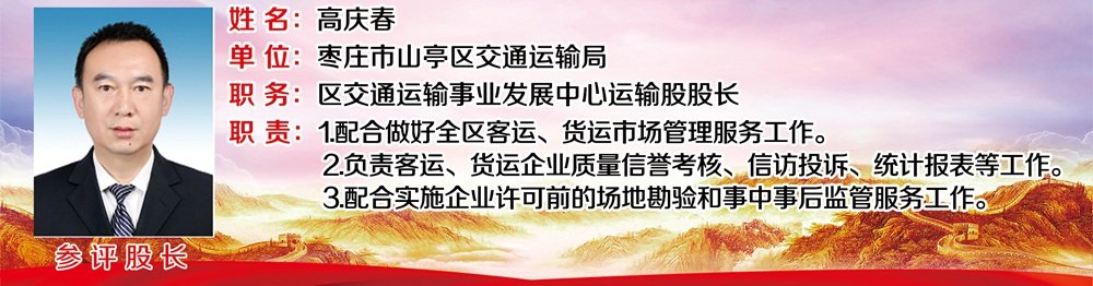 履职成效: 1.协助驾培股完成金飞驾校、冯卯驾校年度质量信誉考核工作; 2.协助驾培股完成山亭区中泰汽车出租有限公司50辆出租车车辆更新材料审核工作。 3.继续抓好长途班线、旅游包车、货运企业和冷链运输企业疫情防控工作。 4.开展对西集、桑村、徐庄、北庄、山城街道货运企业年度质量信誉考核,共计考核56家。 5.对全区7家存在安全隐患的货运企业进行停业处理。 | |