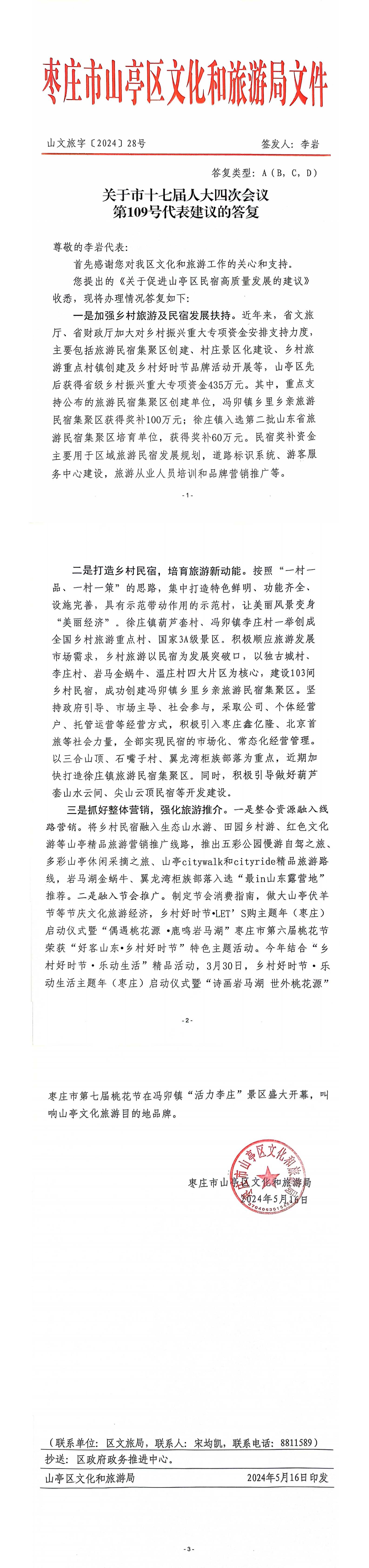 关于市十七届人大四次会议第109号代表建议(促进山亭区民宿高质量发展)的答复