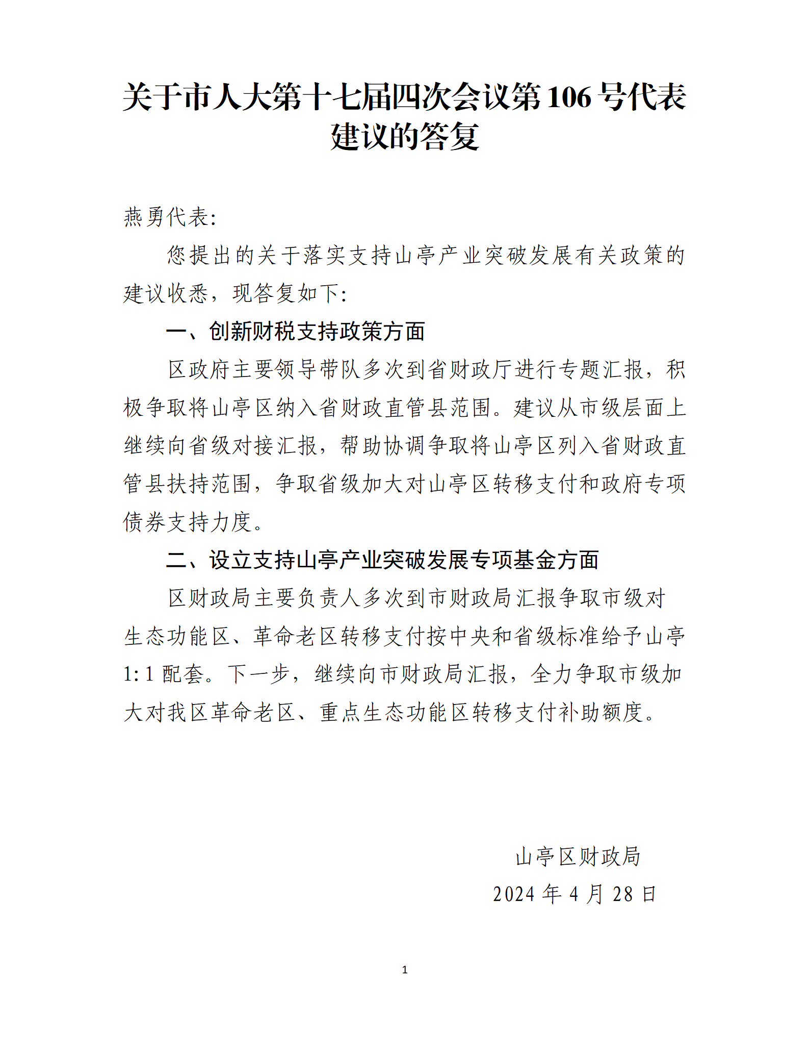 关于市十七届人大四次会议第106号代表建议(支持山亭产业突破发展有关政策)的答复