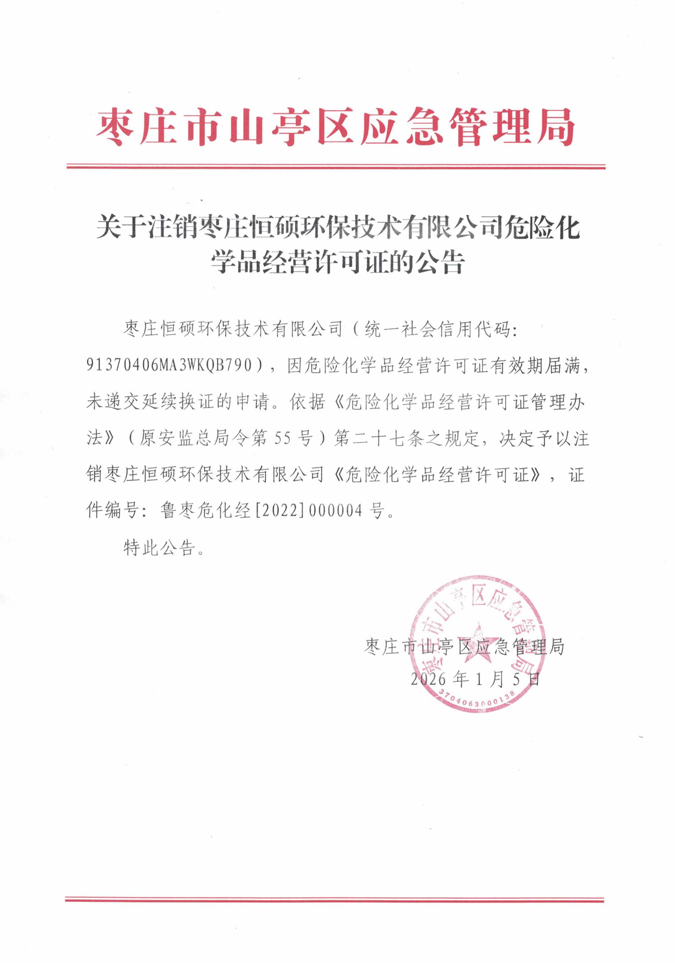 关于注销枣庄恒硕环保技术有限公司危险化学品经营许可证的公告