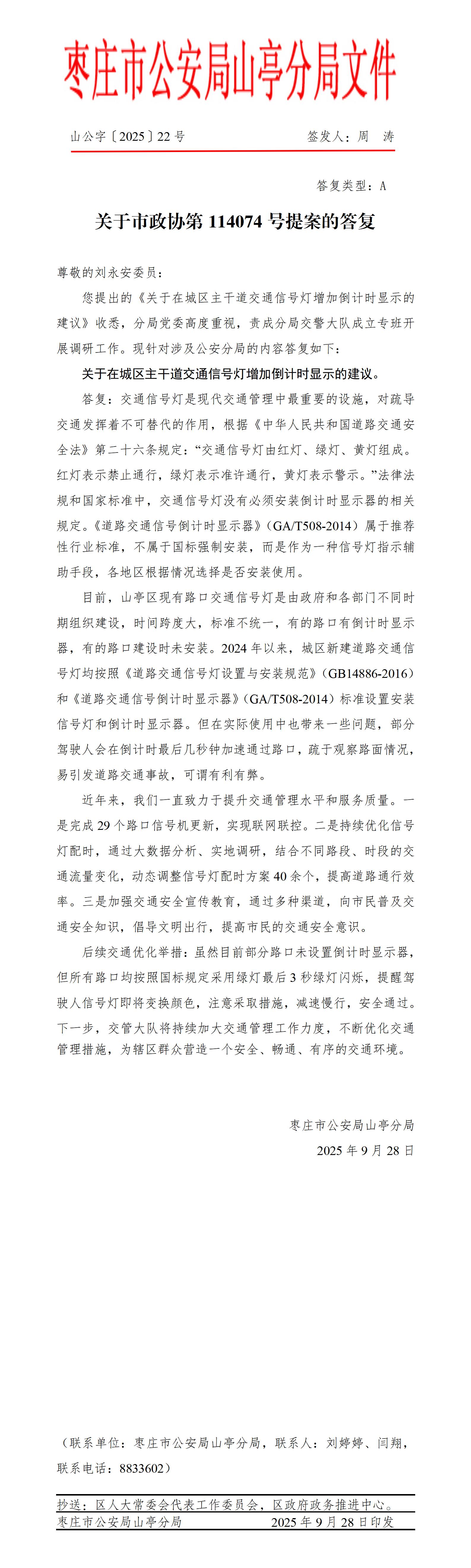 关于对市政协十一届四次会议第114074号委员提案(关于在城区主干道交通信号灯增加倒计时显示)的答复